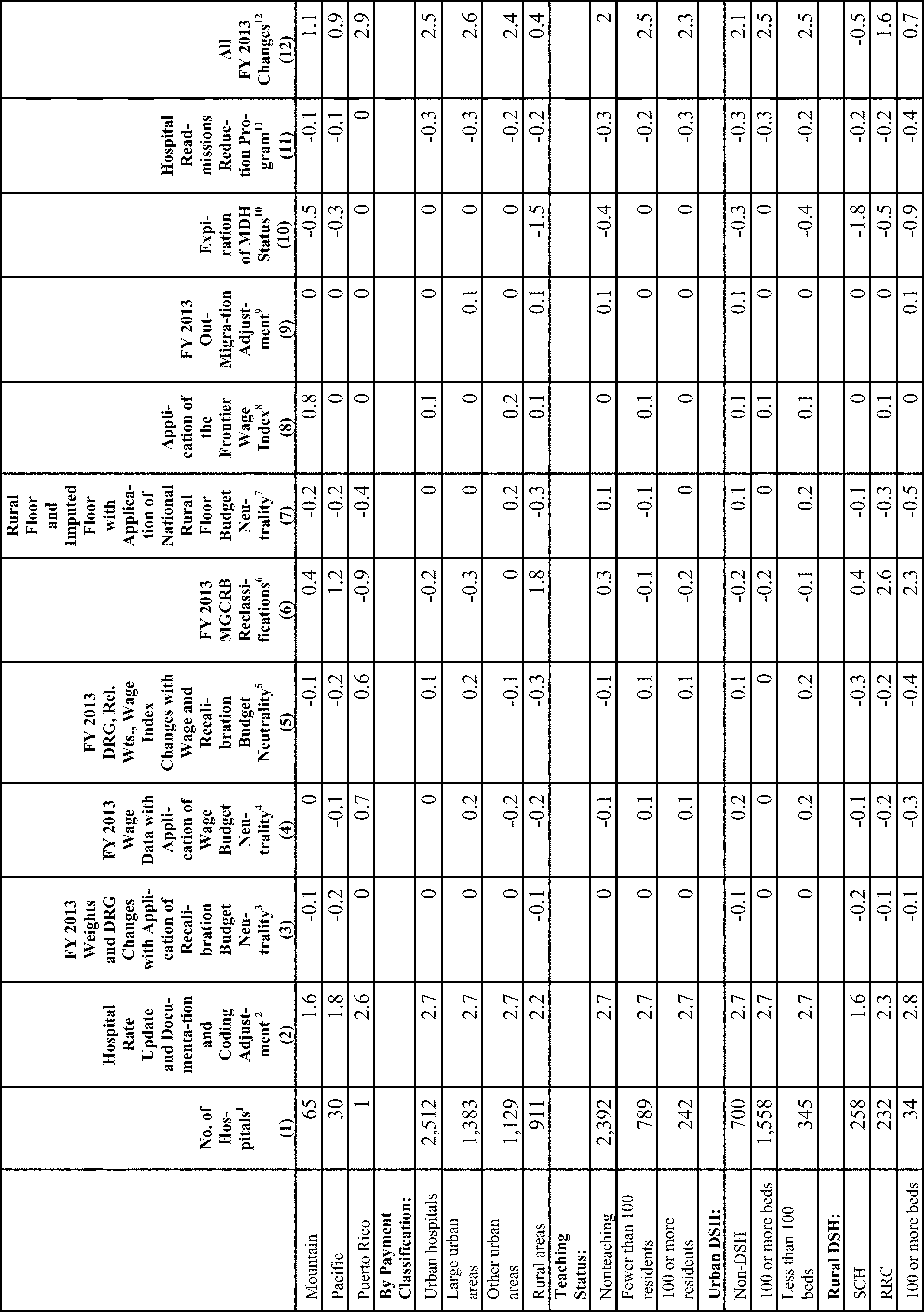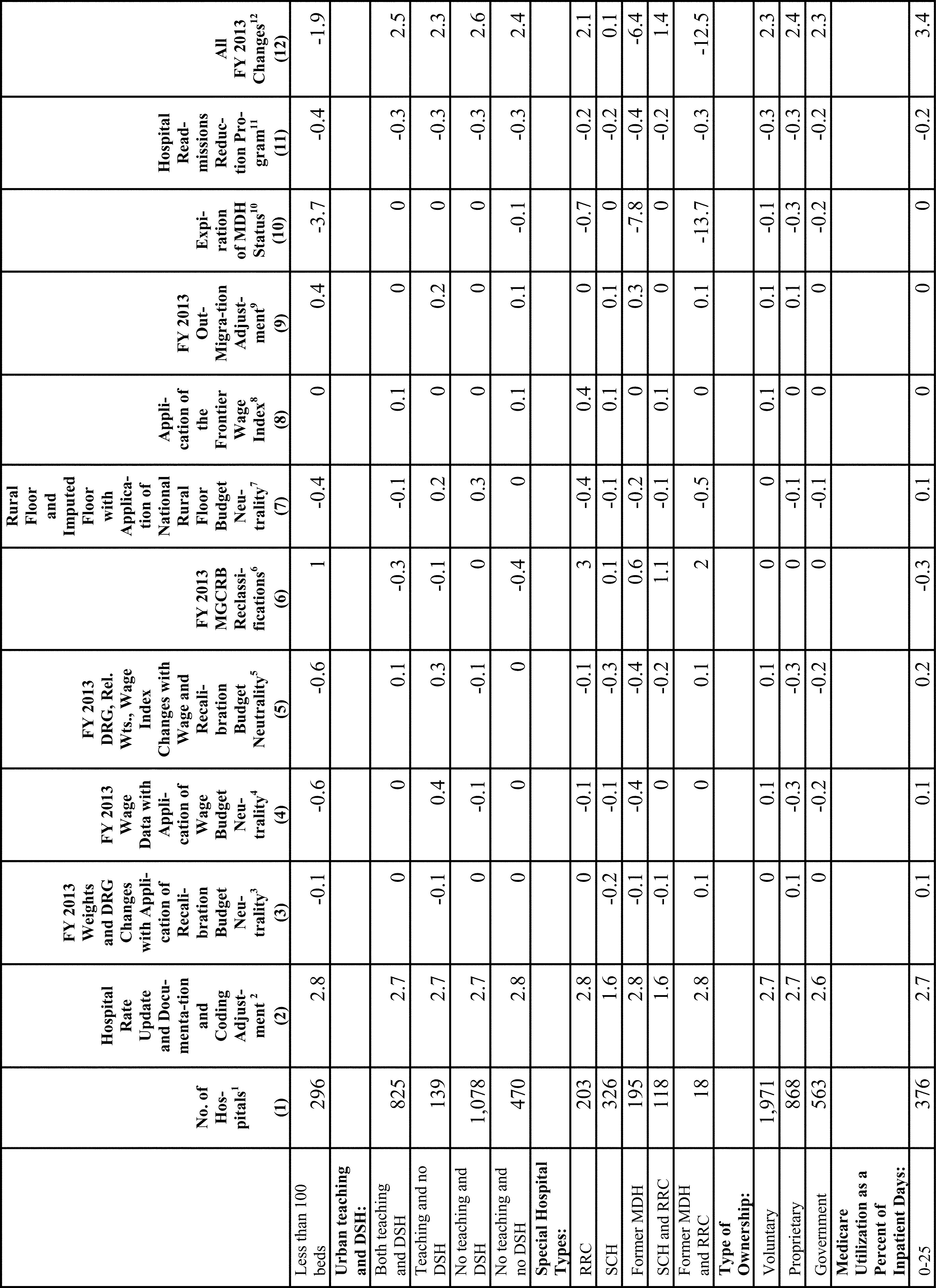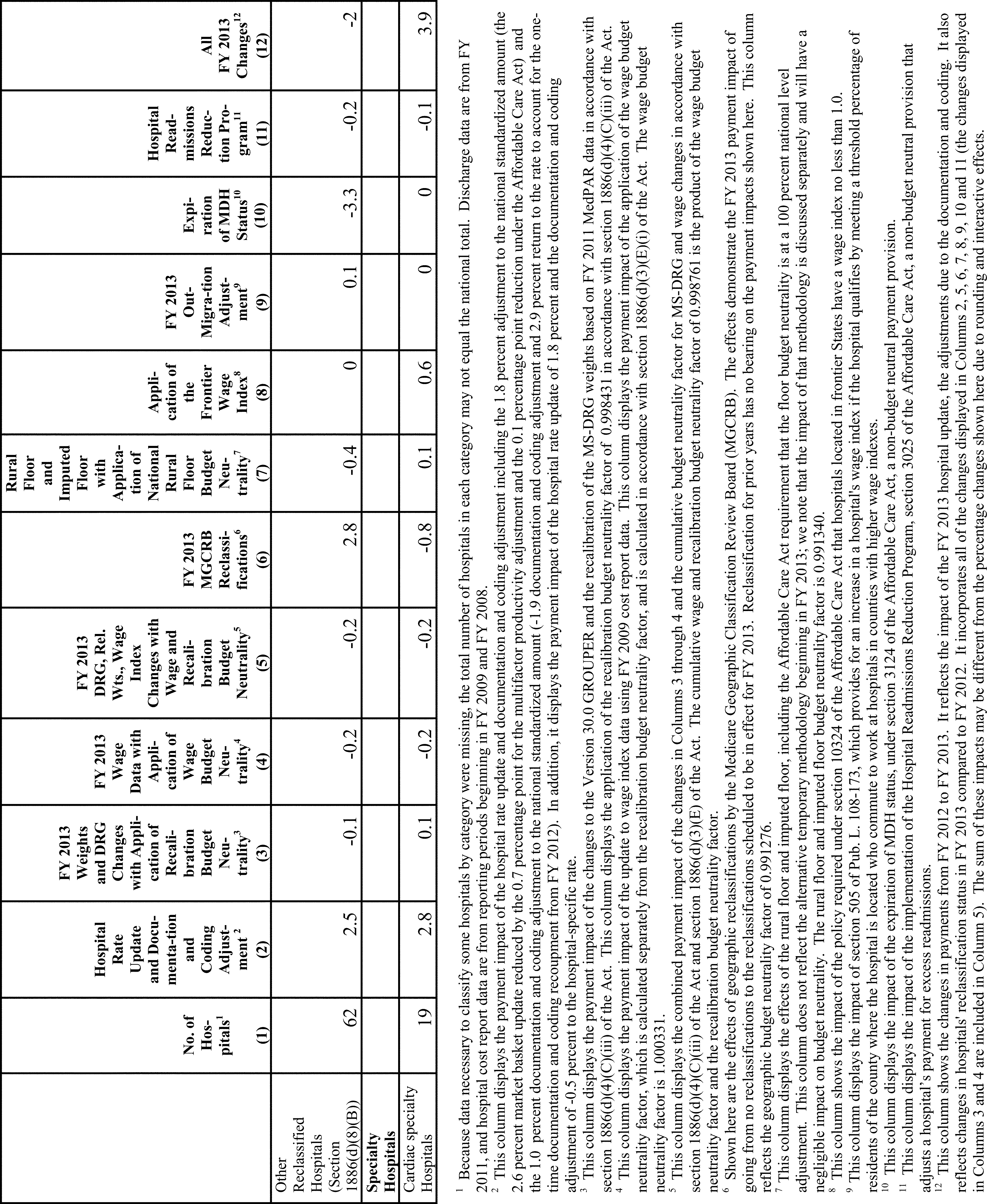 Table I of section I.G. of this Appendix demonstrates the estimated distributional impact of the IPPS budget neutrality requirements for the MS-DRG and wage index changes, and for the wage index reclassifications under the MGCRB. Table I also shows an overall increase of 2.3 percent in operating payments. We estimate that operating payments will increase by approximately $2.45 billion in FY 2013 relative to FY 2012. In addition, we estimate a savings of $24 million associated with the HACs policies in FY 2013, which is an additional $2 million in savings than in FY 2012. In FY 2012, pursuant to section 1109 of the Affordable Care Act, we distributed an additional $250 million to qualifying hospitals resulting in a decrease of $250 million in payments to hospitals in FY 2013 relative to FY 2012. Furthermore, we estimate that the expiration of the expansion of low-volume payments under sections 3125 and 10314 of the Affordable Care Act in FY 2013 will result in a decrease in payments of approximately $318 million compared to low-volume payments made in FY 2012. We estimate that new technology add-on payments will increase payments by approximately $46.1 million. Finally, we estimate that our finalized policies to count labor and delivery bed days in the available bed day count for IME and DSH payments will reduce IME payments by approximately $40 million for FY 2013. These estimates, combined with our FY 2013 operating estimate of $2.45 billion, will result in an increase of approximately $1.87 billion for FY 2013. We estimate that capital payments will experience a 1.8 percent increase in payments per case, as shown in Table III of section I.I. of this Appendix. We project that there will be a $154 million increase in capital payments in FY 2013 compared to FY 2012. The cumulative operating and capital payments should result in a net increase of approximately $2.04 billion to IPPS providers. The discussions presented in the previous pages, in combination with the rest of this final rule, constitute a regulatory impact analysis.