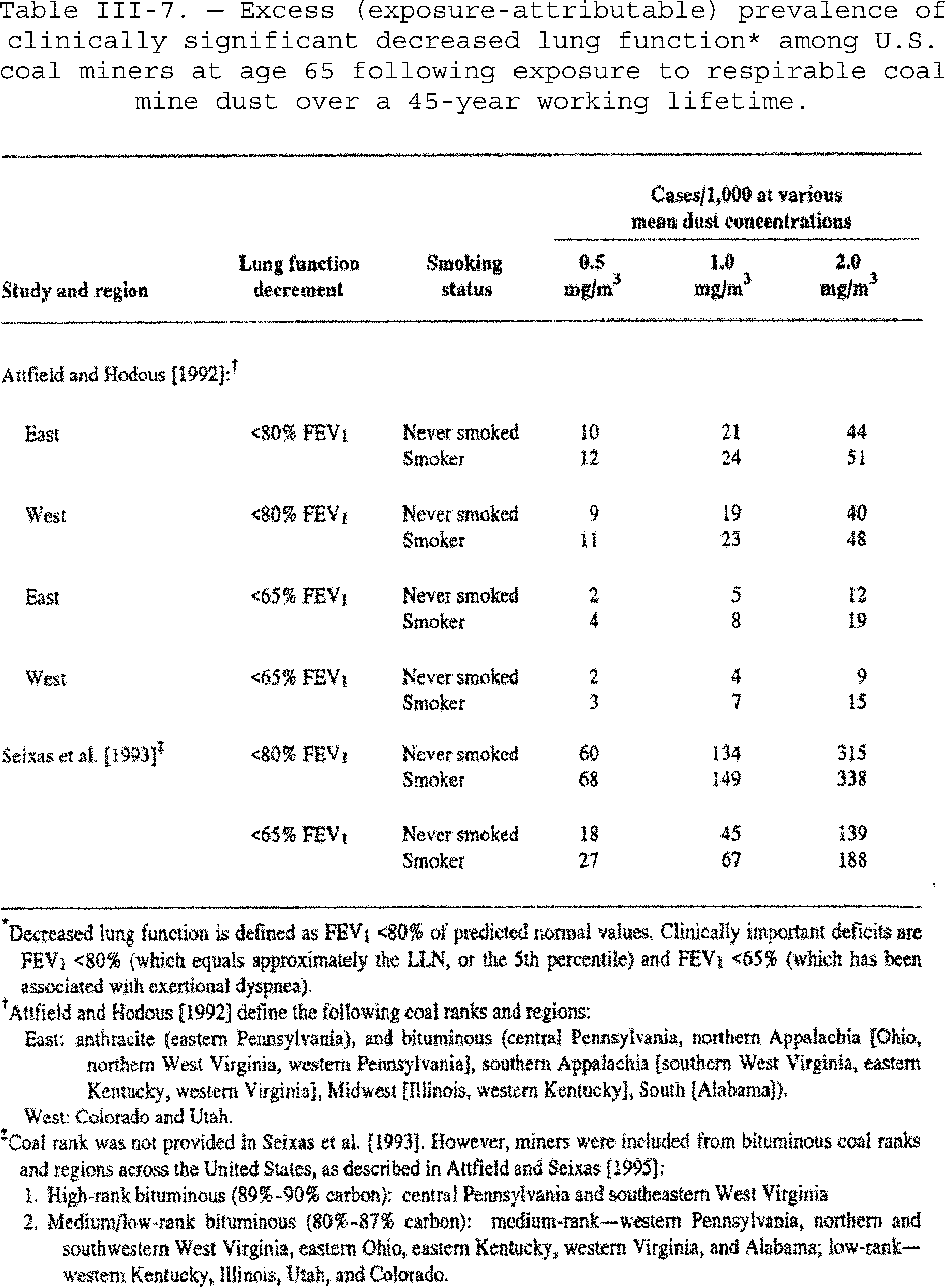 slightly when silica exposure was included in the model. For CWP mortality, the regression coefficient for respirable coal mine dust exposure was 0.0058 when quartz exposure was excluded and 0.0060 when quartz exposure was included (Miller et al. (2007), Table 5.9). For COPD mortality, the coefficient for respirable coal mine dust exposure was 0.0016 when quartz exposure was excluded and 0.0019 when quartz exposure was included. (Miller et al. (2007), Table 5.18). Exposure units for both respirable coal mine dust and silica were g-hr/m3.