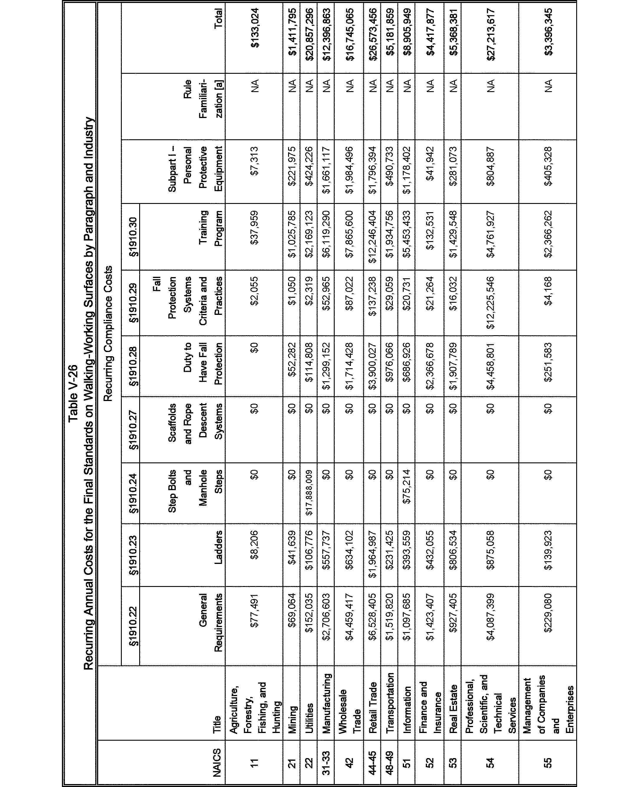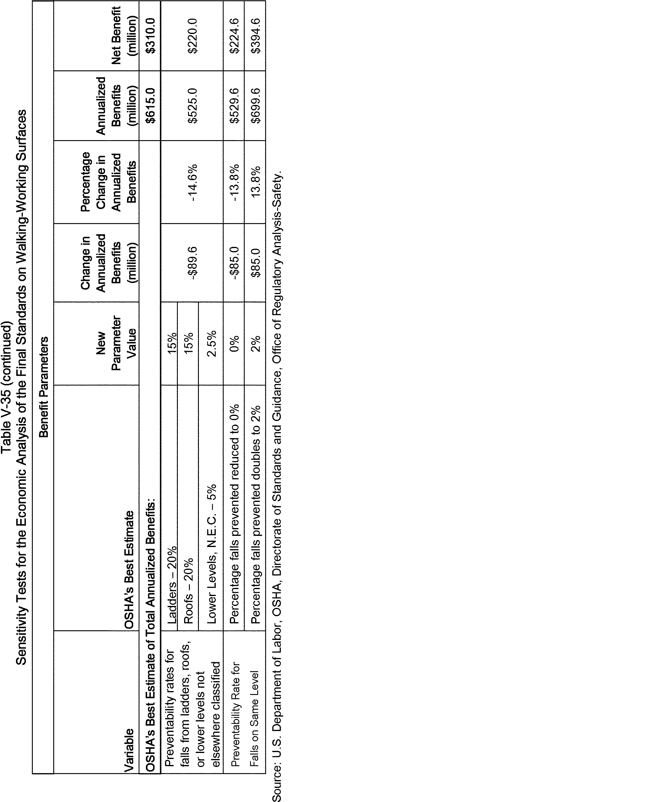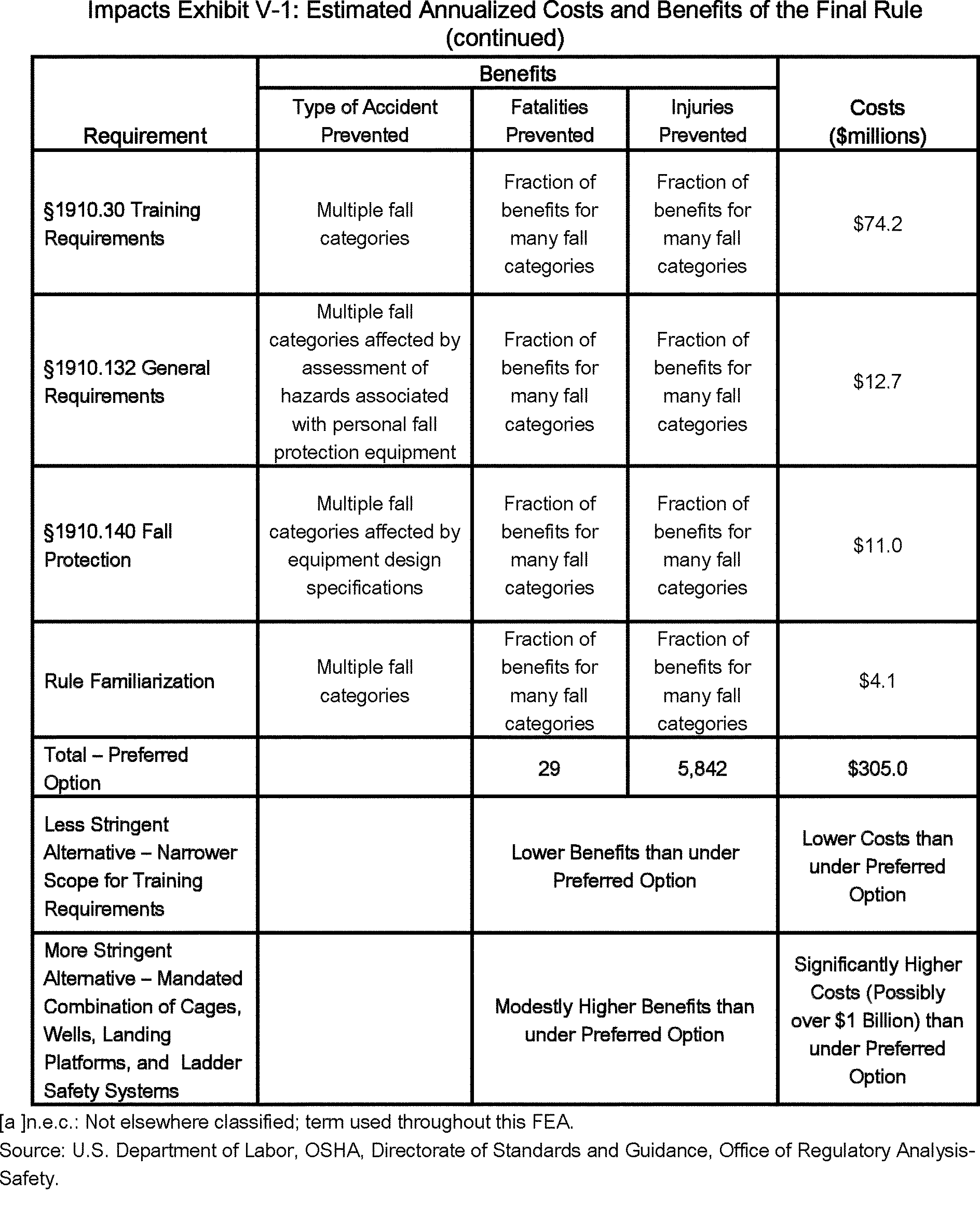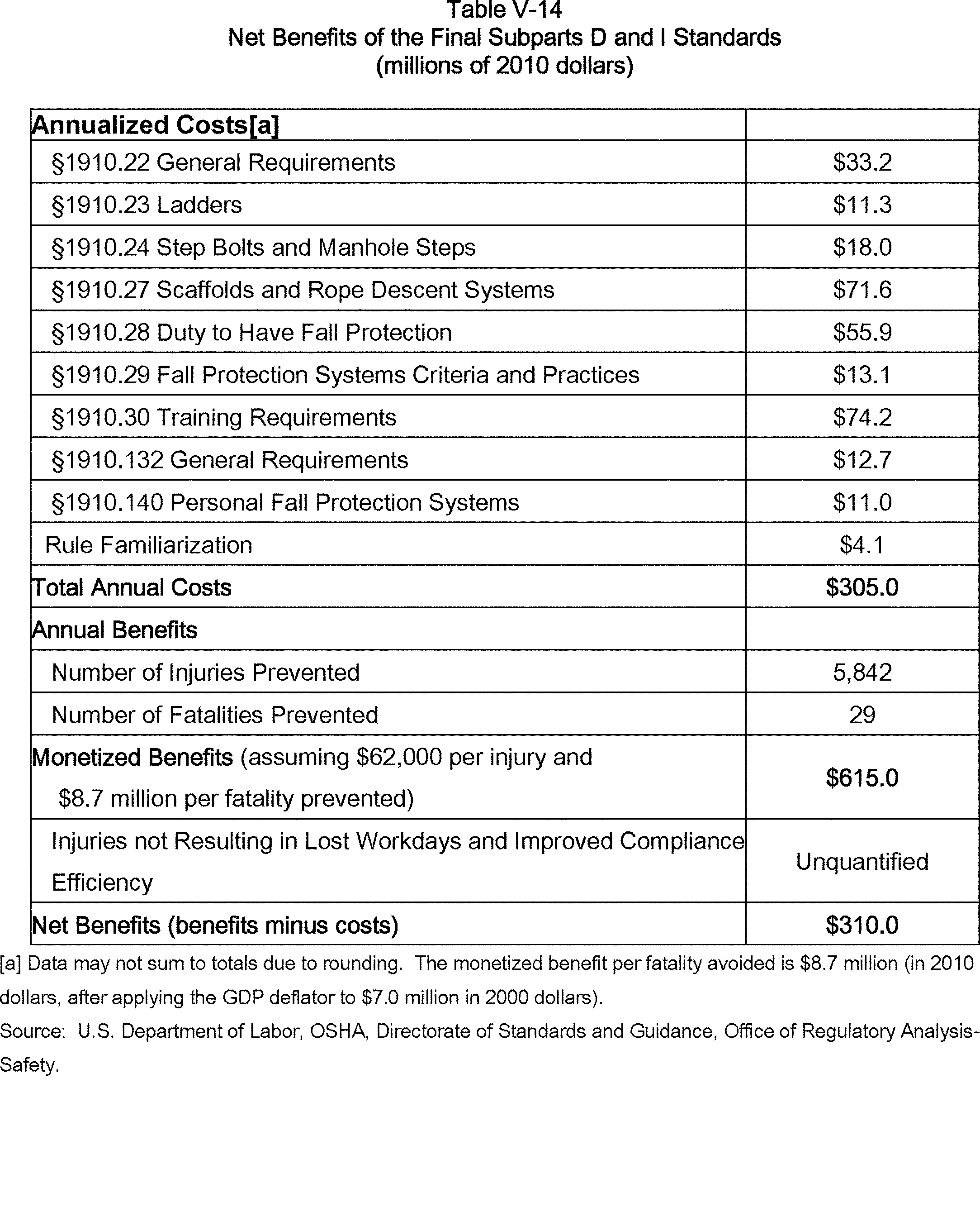 The OSH Act requires OSHA to make certain findings with respect to standards. One of these findings, specified by Section 3(8) of the OSH Act, requires an OSHA standard to address a significant risk and to reduce this risk significantly. (See Industrial Union Dep't v. American Petroleum Institute, 448 U.S. 607 (1980).) As discussed in Section II of this preamble, OSHA finds that slips, trips, and falls constitute a significant risk, and estimates that the final standard will prevent 29 fatalities and 5,842 injuries annually. Section 6(b) of the OSH Act requires OSHA to determine if its standards are technologically and economically feasible. As discussed in Section V of this preamble, OSHA finds that this final standard is economically and technologically feasible. The table below summarizes OSHA's findings with respect to the estimated costs, benefits, and net benefits of this standard. The annual benefits are significantly in excess of the annual costs. However, it should be noted that under the OSH Act, OSHA does not use the magnitude of net benefits as the decision-making criterion in determining what standards to promulgate.