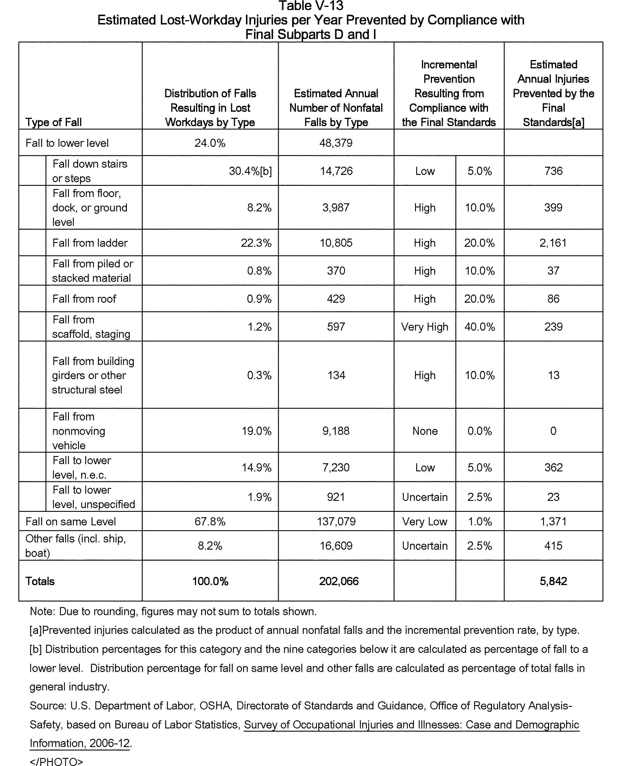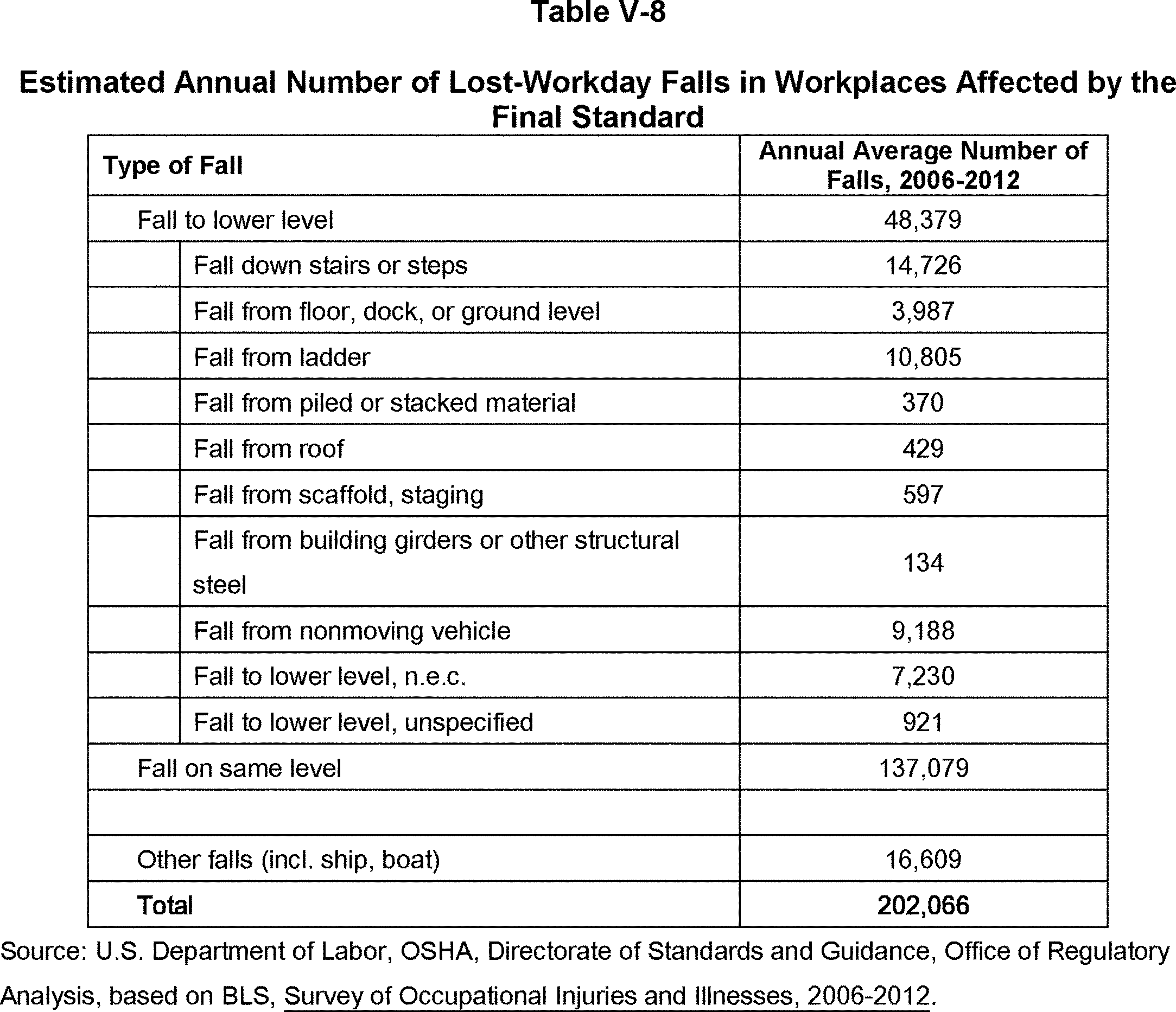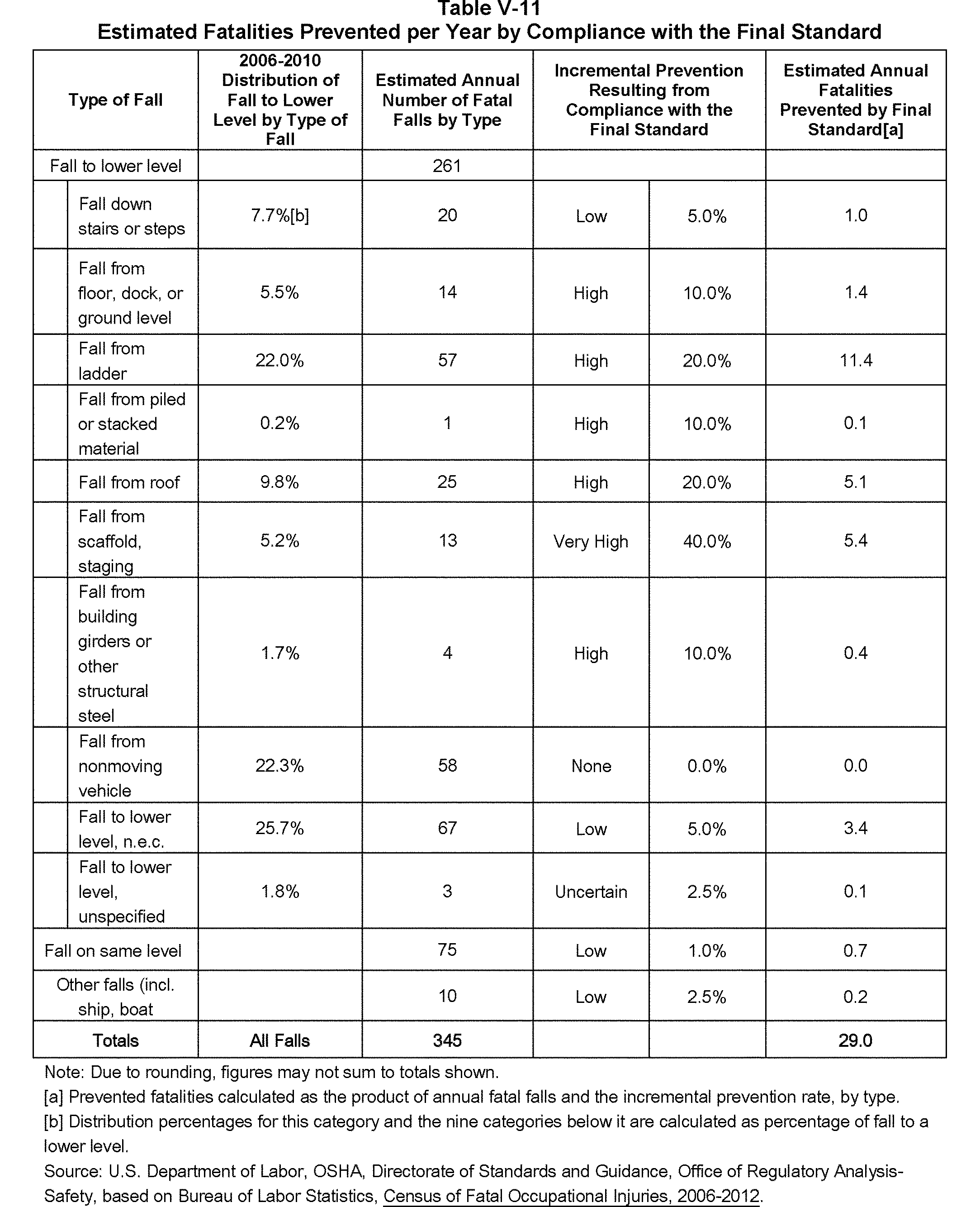 In the proposed rule, the Agency preliminarily concluded that falls constitute a significant risk and that the proposed standards would substantially reduce the risk of falls to employees (75 FR 28861, 28865-28866 (5/24/2010)). The analysis of U.S. Bureau of Labor Statistics (BLS) data from 1992 to 2004 identified an annual average of 300 fatal falls, 213 (71 percent) of which resulted from falls to a lower level and an annual average of 299,404 non-fatal falls resulting in lost-workday injuries, Start Printed Page 8249879,593 (26 percent) of which were as a result of falls to a lower level. The Agency's analysis also estimated that compliance with the proposed requirements in subparts D and I annually would prevent 20 fatal to a lower level and 3,706 lost-workday injuries due to falls to a lower level.