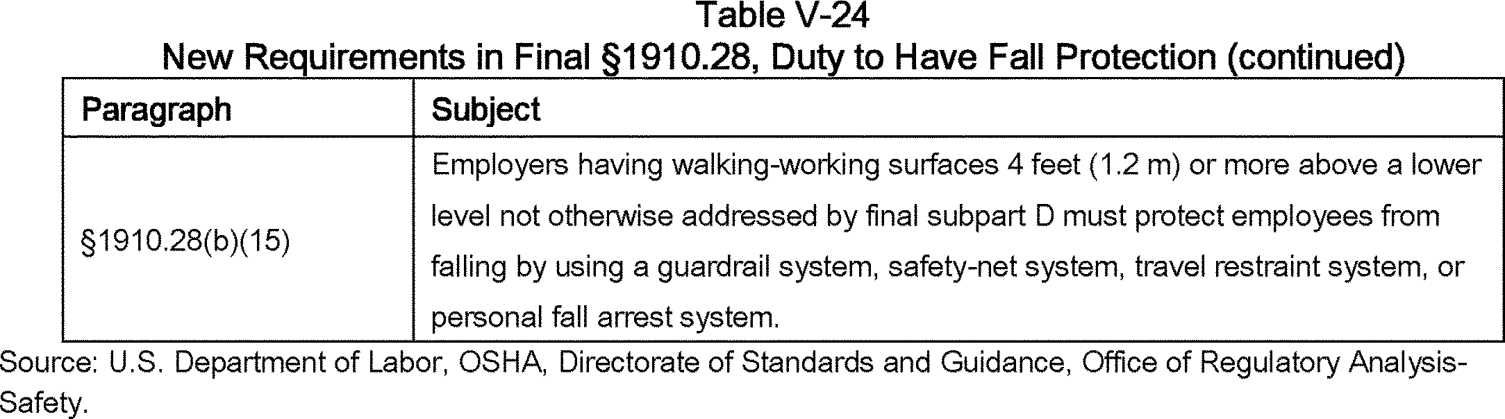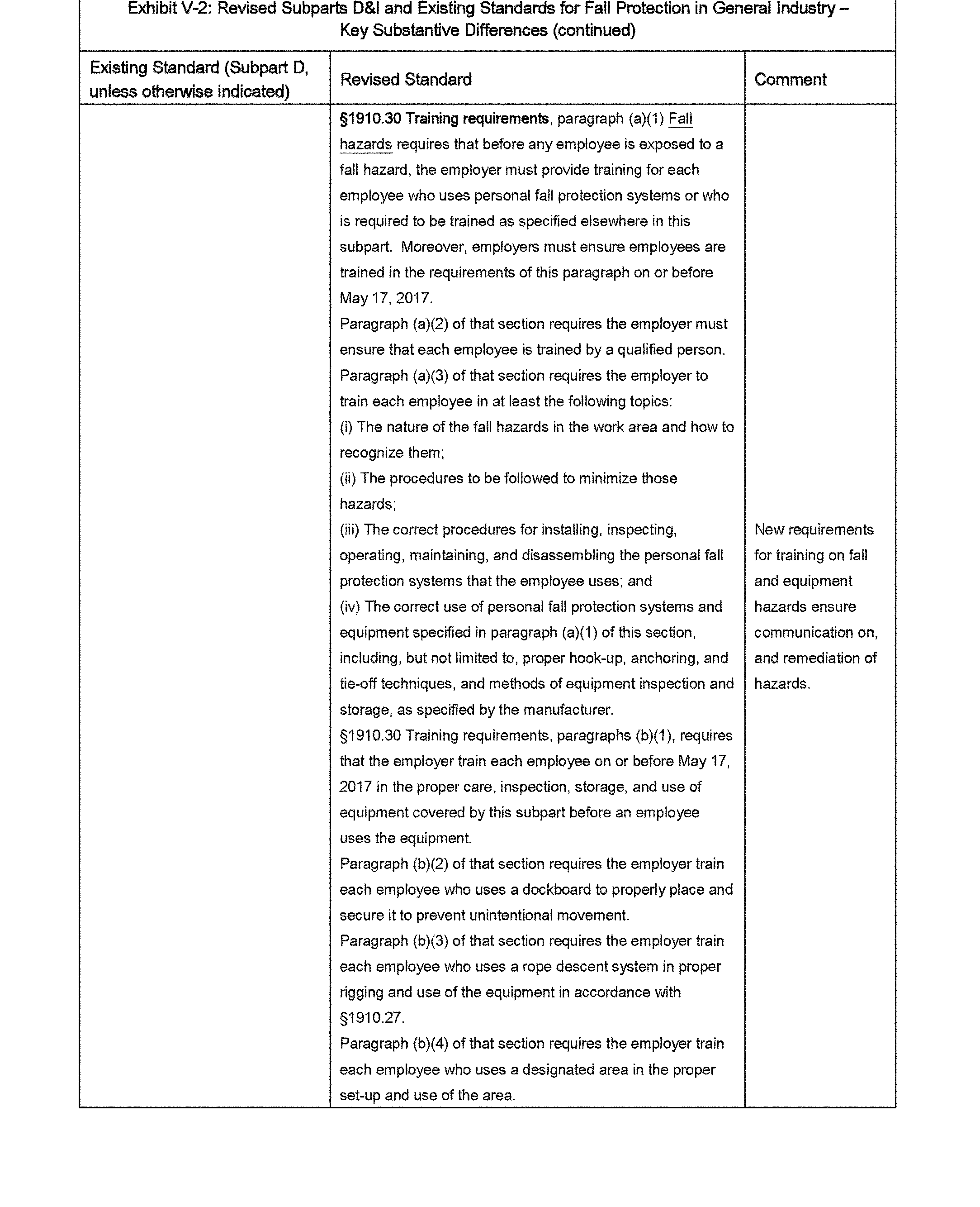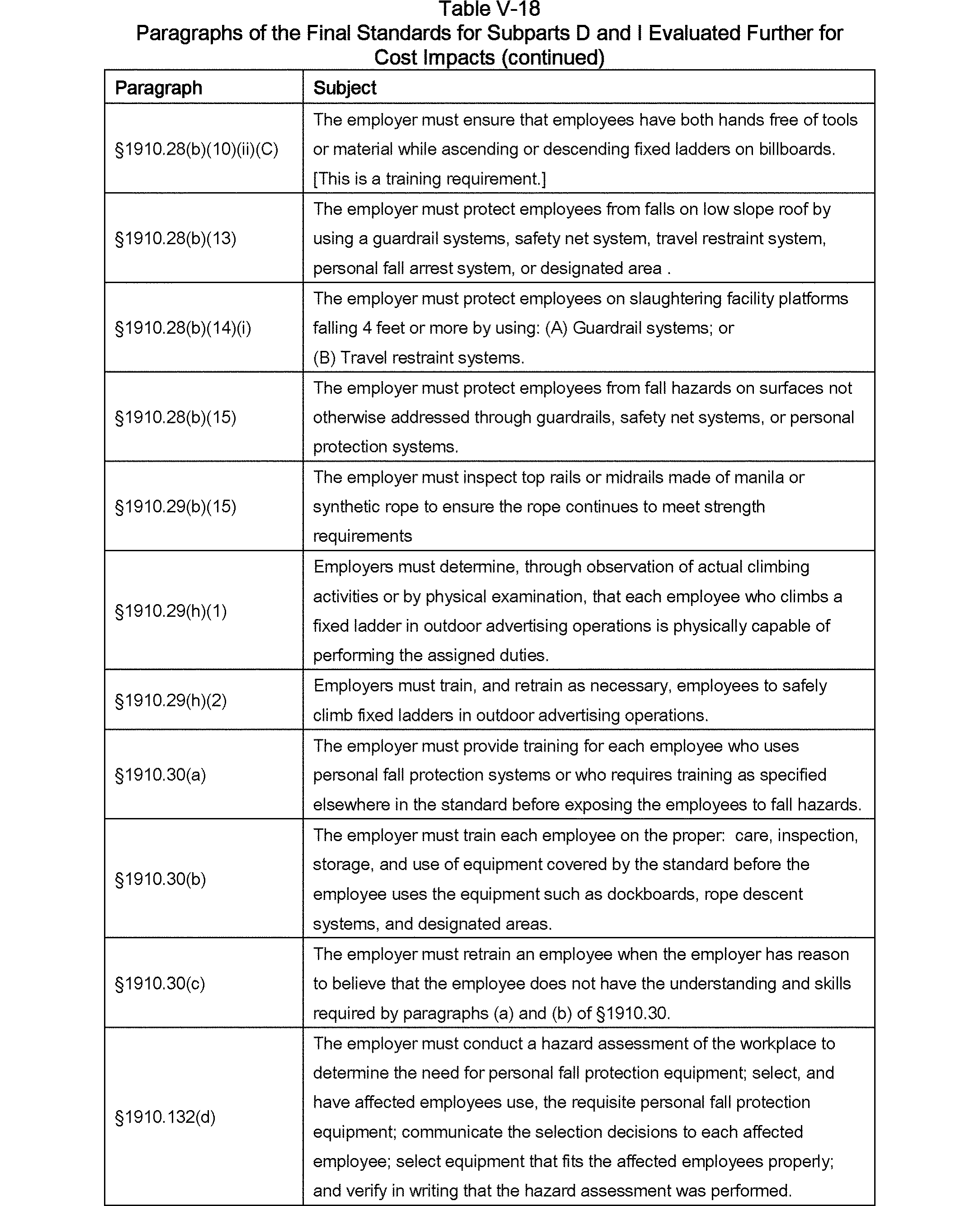 The final rule covers all general industry walking-working surfaces, including but not limited to, floors, ladders, stairways, runways, dockboards, roofs, scaffolds, and elevated work surfaces and walkways. To protect workers from hazards associated with those surfaces, particularly hazards related to falls from elevations, the final rule updates and revises the general industry Walking-Working Surfaces standards (29 CFR part 1910, subpart D). The final rule includes revised and new provisions that address, for example, fixed ladders; rope descent systems; fall protection systems and criteria, including personal fall protection systems; and training on fall hazards and fall protection systems. In addition, the final rule adds new requirements on the design, performance, and use of personal fall protection systems to the general industry Personal Protective Equipment (PPE) standards (29 CFR part 1910, subpart I). These and other measures the final rule incorporates reflect advances in technology and industry best practices that have been developed since OSHA adopted subpart D in 1971.