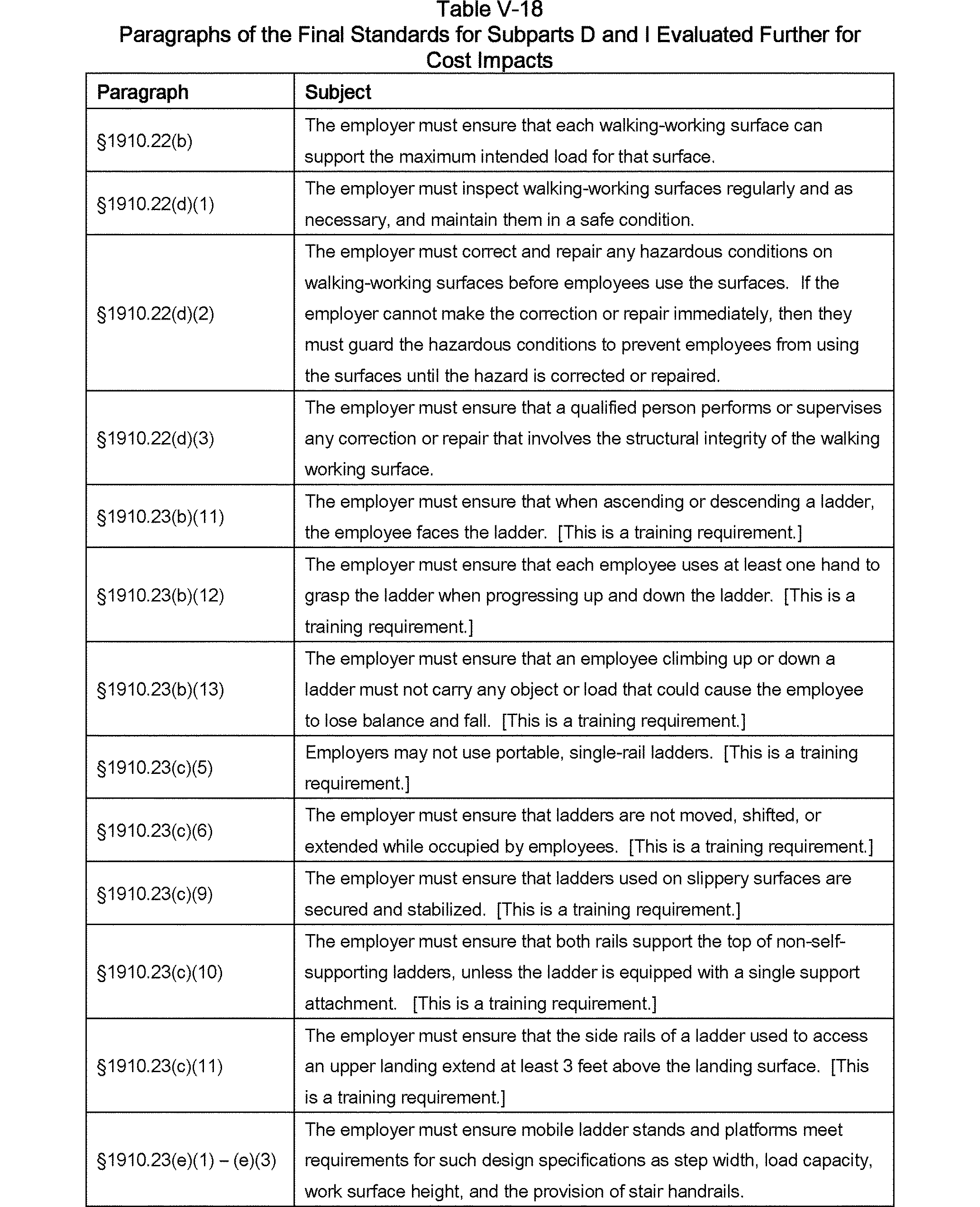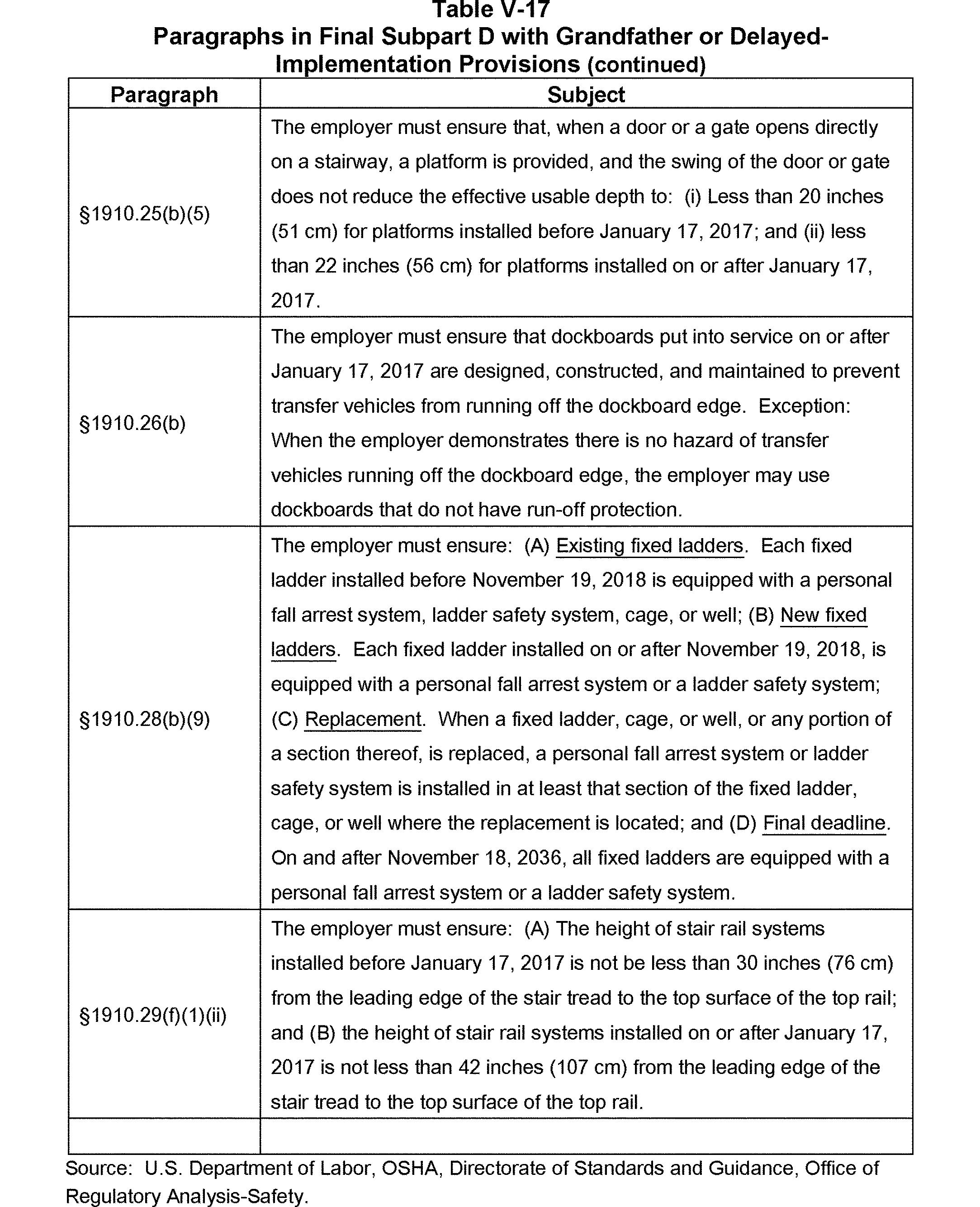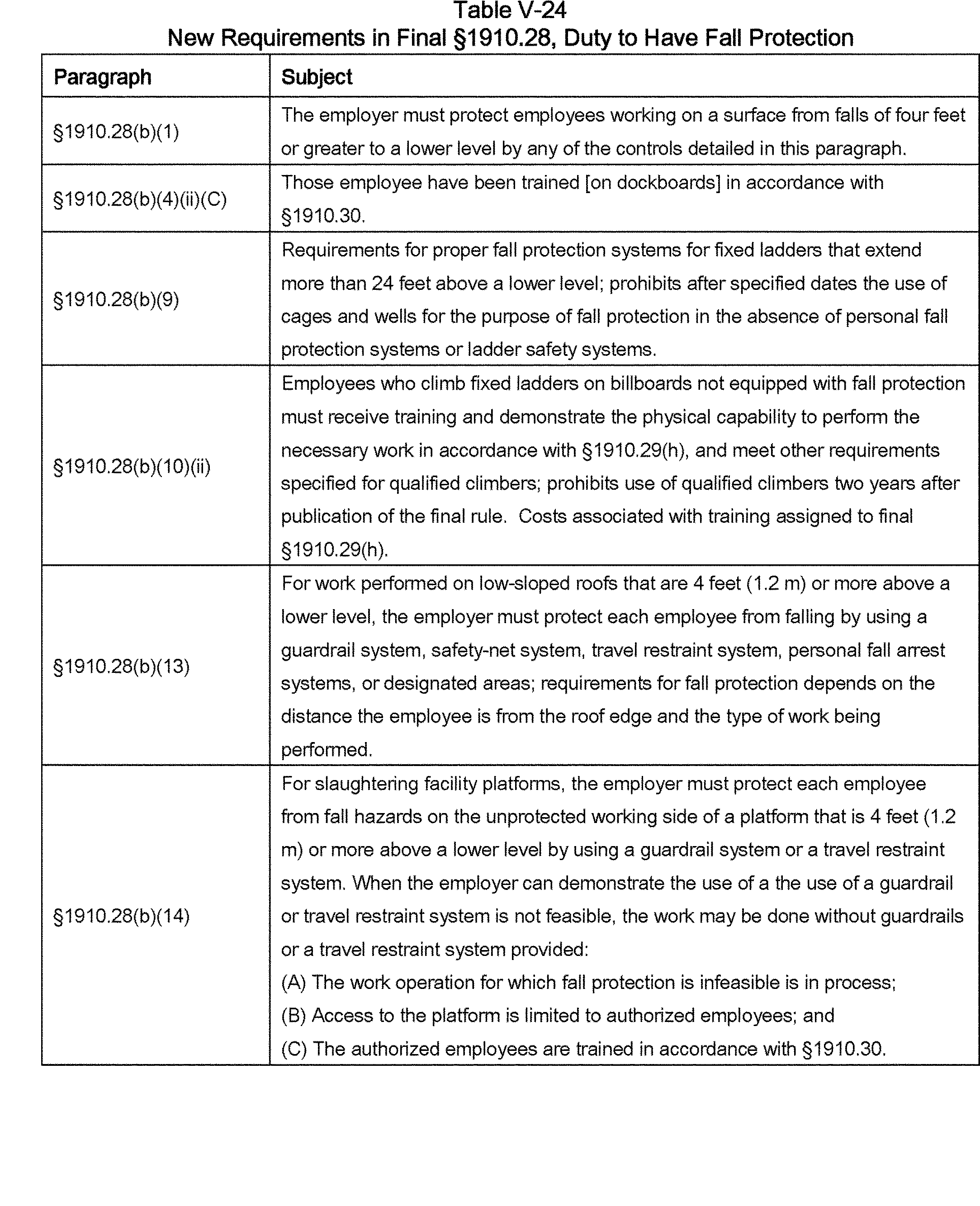 The final rule covers all general industry walking-working surfaces, including but not limited to, floors, ladders, stairways, runways, dockboards, roofs, scaffolds, and elevated work surfaces and walkways. To protect workers from hazards associated with those surfaces, particularly hazards related to falls from elevations, the final rule updates and revises the general industry Walking-Working Surfaces standards (29 CFR part 1910, subpart D). The final rule includes revised and new provisions that address, for example, fixed ladders; rope descent systems; fall protection systems and criteria, including personal fall protection systems; and training on fall hazards and fall protection systems. In addition, the final rule adds new requirements on the design, performance, and use of personal fall protection systems to the general industry Personal Protective Equipment (PPE) standards (29 CFR part 1910, subpart I). These and other measures the final rule incorporates reflect advances in technology and industry best practices that have been developed since OSHA adopted subpart D in 1971.