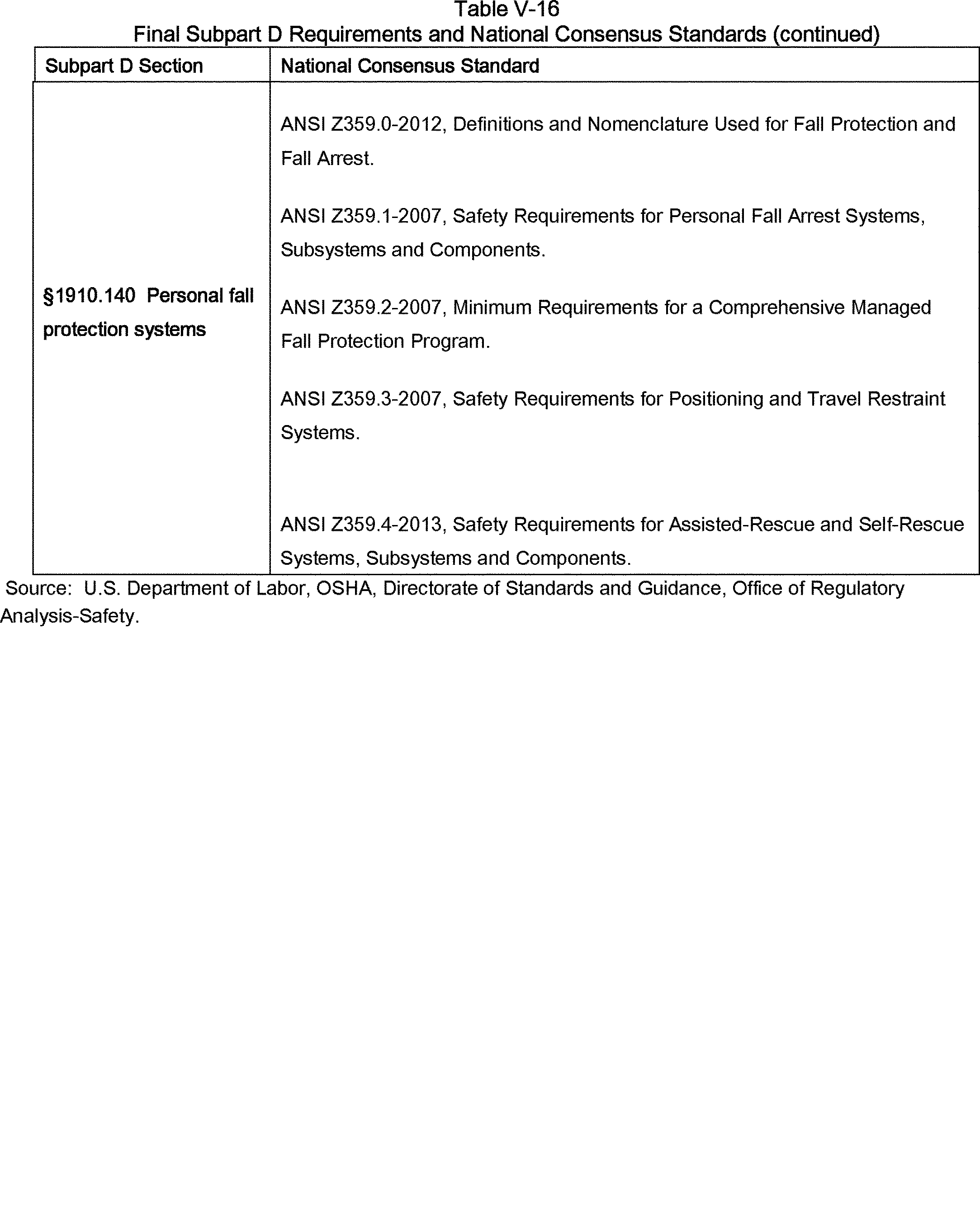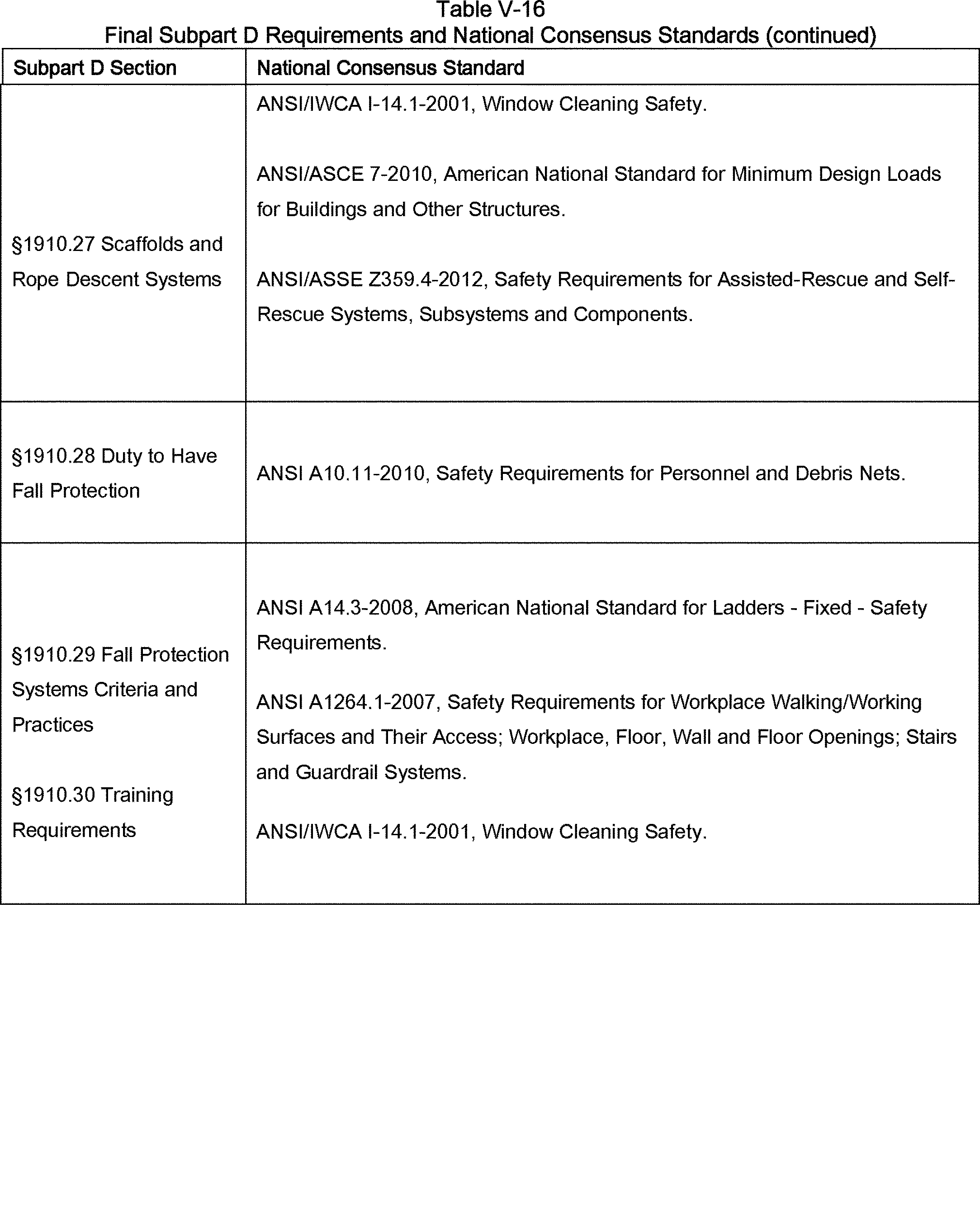 OSHA also drew many provisions in the final rule from national consensus standards, including ANSI/ASSE A1264.1-2007, Safety Requirements for Workplace Walking/Working Surfaces and Their Access; Workplace, Floor, Wall and Roof Openings; Stairs and Guardrail Systems; ANSI/ASSE Z359.1-2007, Safety Requirements for Personal Fall Arrest Systems, Subsystems and Components; and ANSI/IWCA I-14.1-2001, Window Cleaning Safety Standard. Many stakeholders recommended that OSHA incorporate the requirements in those standards into the final rule. OSHA agrees with stakeholders that national consensus standards represent industry best practices and reflect advancements in technology, methods, and practices developed in the years since the Agency adopted the existing rule.