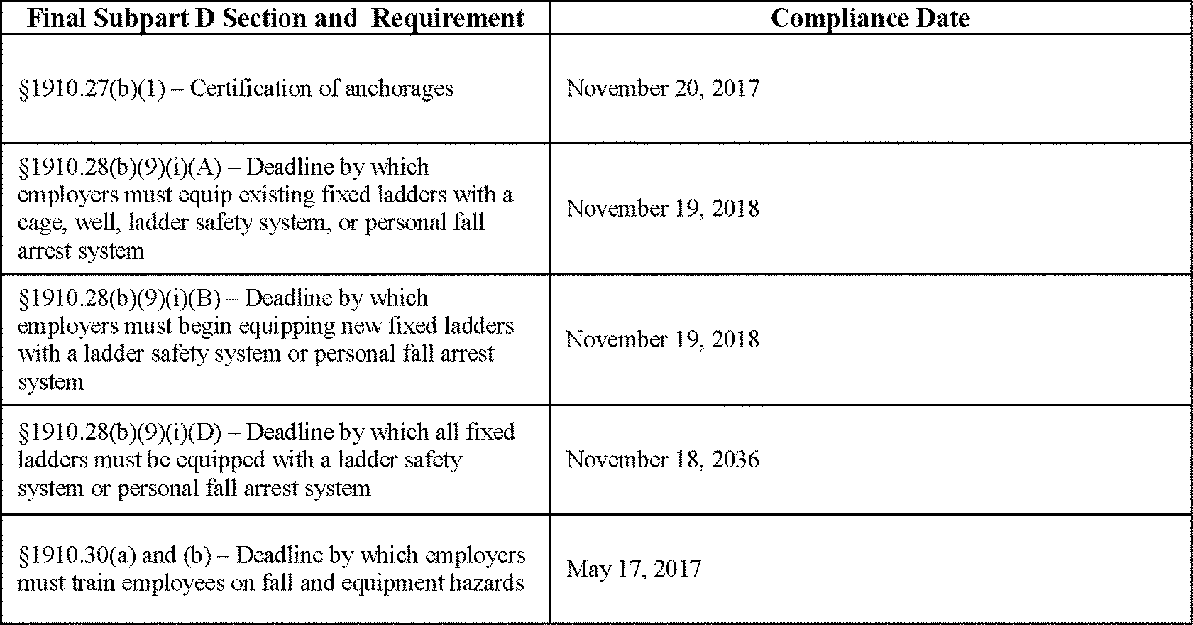 OSHA believes that many employers already are in compliance with many provisions in the final rule; therefore, they should not have significant problems implementing it. OSHA also has included measures to make implementation of the final rule easier for employers. The final rule provides extended compliance dates for implementing some requirements and applies other requirements only prospectively. For example, the final rule gives employers as much as 20 years to equip fixed ladders with personal fall arrest or ladder safety systems. Moreover, since the final rule incorporates requirements from national consensus standards, most equipment manufacturers already provide equipment and systems that meet the requirements of the final rule.