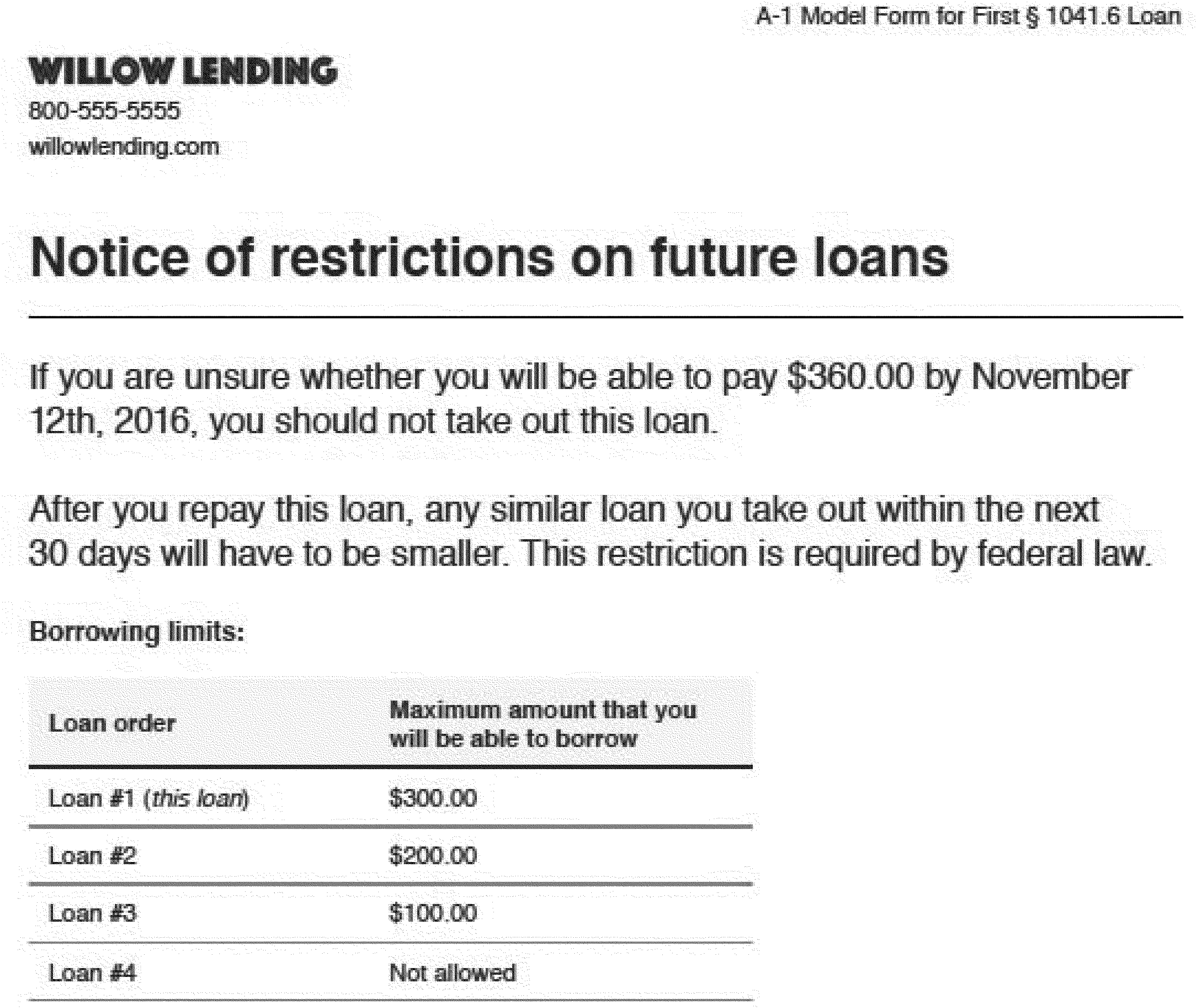 Second, and in the alternative, a lender is allowed to make a covered short-term loan without meeting all the specific underwriting criteria set out above, as long as the loan satisfies certain prescribed terms, the lender confirms that the consumer meets specified borrowing history conditions, and the lender provides required disclosures to the consumer. Among other conditions, under this alternative approach, a lender is allowed to make up to three covered short-term loans in short succession, provided that the first loan has a principal amount no larger than $500, the second loan has a principal amount at least one-third smaller than the principal amount on the first loan, and the third loan has a principal amount at least two-thirds smaller than the principal amount on the first loan. In addition, a lender is not allowed to make a covered short-term loan under the alternative requirements if it would result in the consumer having more than six covered short-term loans during a consecutive 12-month period or being in debt for more than 90 days on covered short-term loans during a consecutive 12-month period. A lender is not permitted to take vehicle security in connection with loans that are made according to this alternative approach.