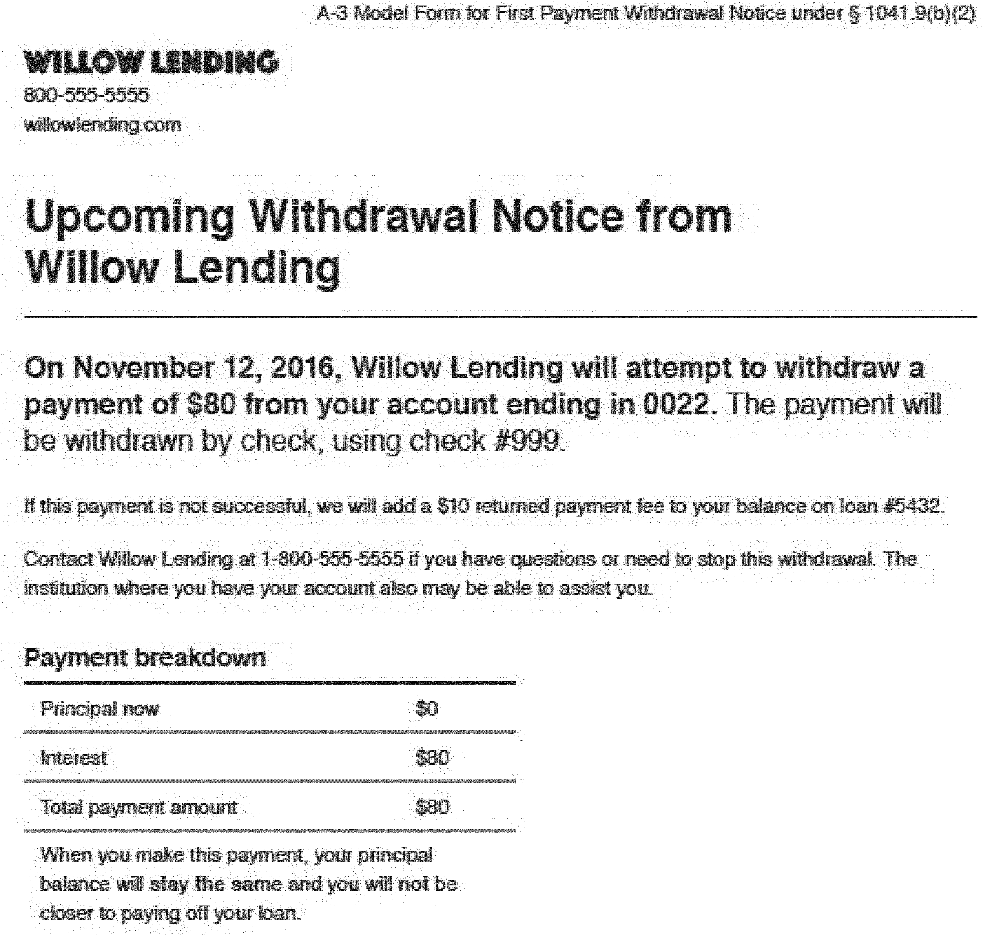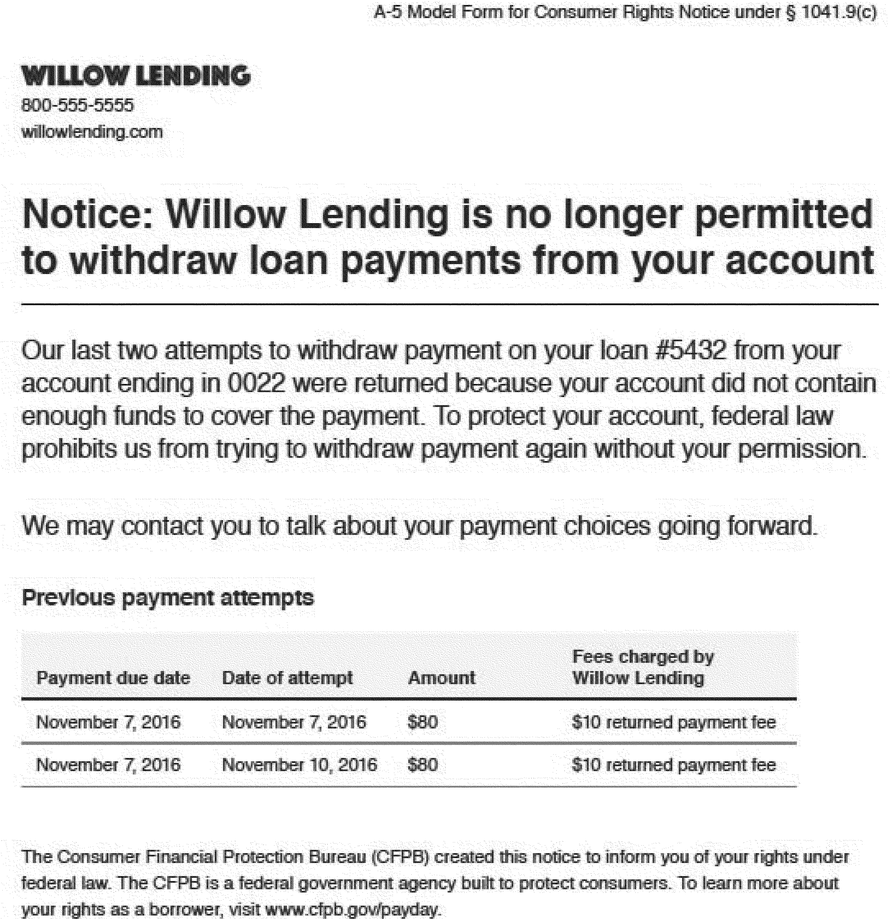 In addition to the requirements related to the prohibition on further payment withdrawal attempts, a lender is required to provide a written notice, depending on means of delivery, a certain number of days before its first attempt to withdraw payment for a covered loan from a consumer's checking, savings, or prepaid account or before an attempt to withdraw such payment in a different amount than the regularly scheduled payment amount, on a date other than the regularly scheduled payment date, by a different payment channel than the prior payment, or to re-initiate a returned prior transfer. The notice must contain key information about the upcoming payment attempt and, if applicable, alert the consumer to unusual payment attempts. A lender is permitted to provide electronic notices as long as the consumer consents to electronic communications.