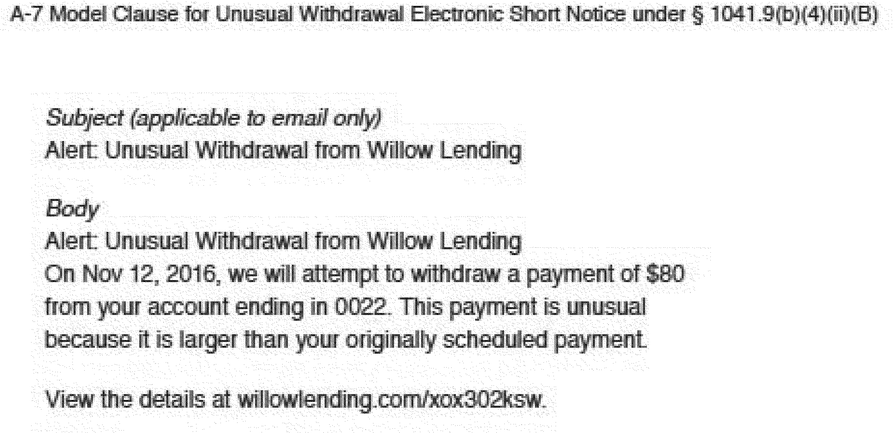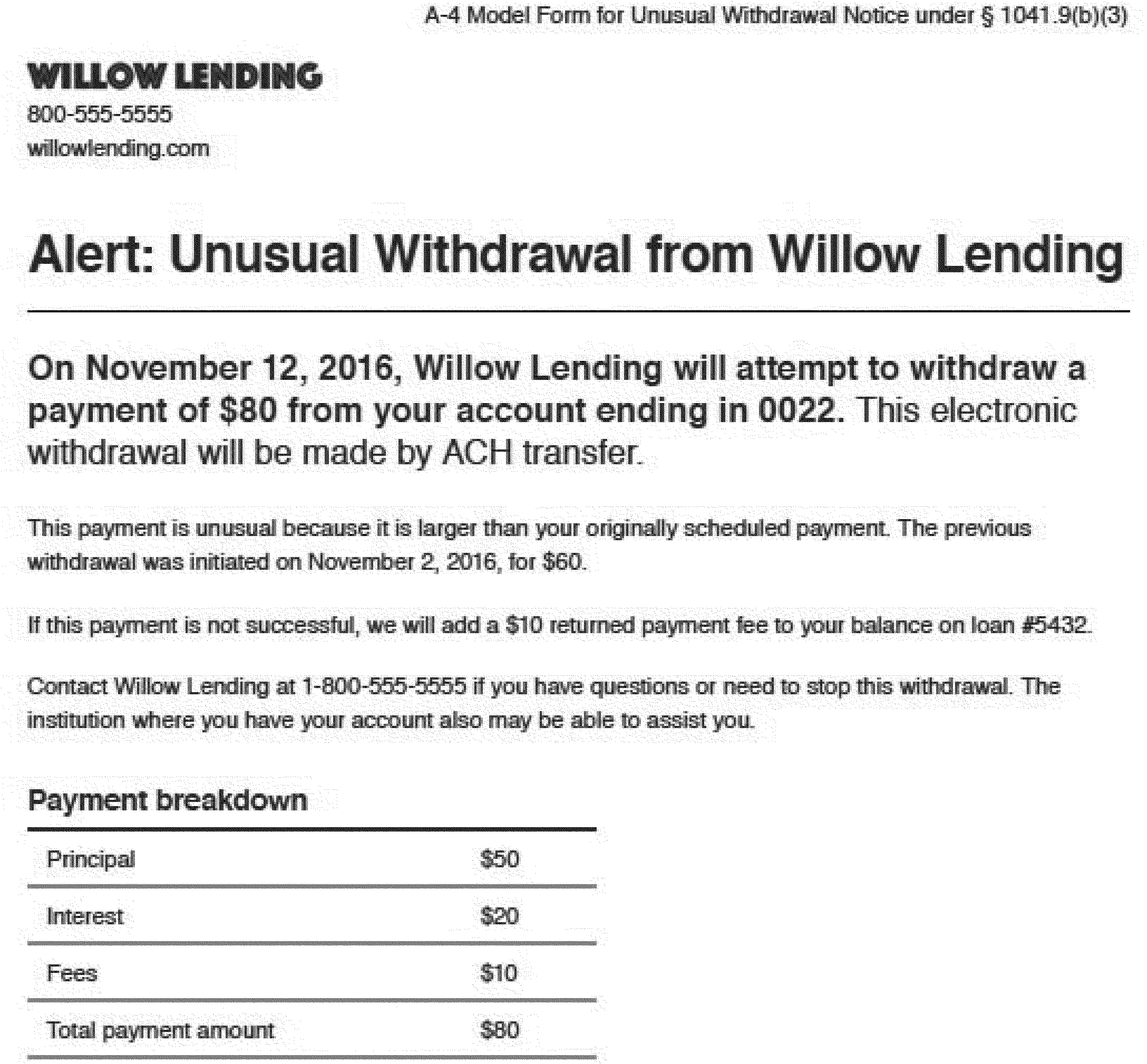 2. Illustrative example. The lender provides a first payment withdrawal notice at origination. The first payment withdrawal initiated by the lender occurs on March 1, for $75, as a paper check. The second payment is scheduled for April 1, for $75, as an ACH transfer. Before the second payment, the lender provides an unusual withdrawal notice. The notice contains the basic payment information along with an explanation that the withdrawal is unusual because the payment channel has changed from paper check to ACH. Because the amount did not vary, the payment is taking place on the regularly scheduled date, and this is not a re-initiated payment, the only applicable content under § 1041.9(b)(3)(ii)(C) is the different payment channel information.