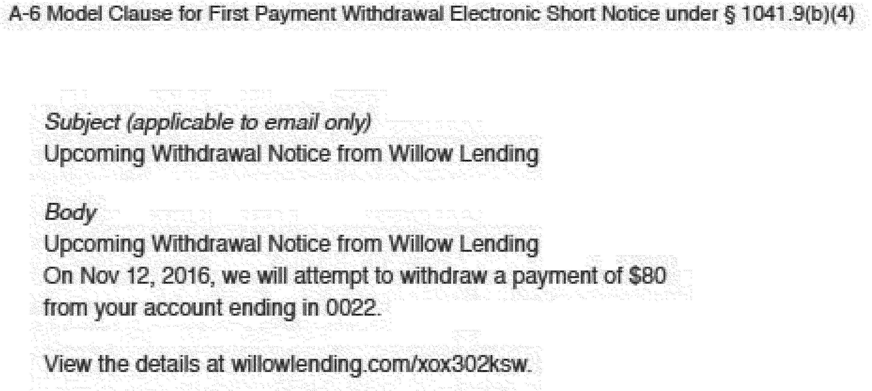 1. General. If the lender is using a method of electronic delivery other than email, such as text or mobile application, the lender must provide the notice with the electronic short notice as provided in § 1041.9(b)(4)(ii). If the lender is using email as the method of electronic delivery, § 1041.9(b)(4)(iii) allows the lender to determine whether to use the electronic short notice Start Printed Page 54918approach or to include the full text of the notice in the body of the email.