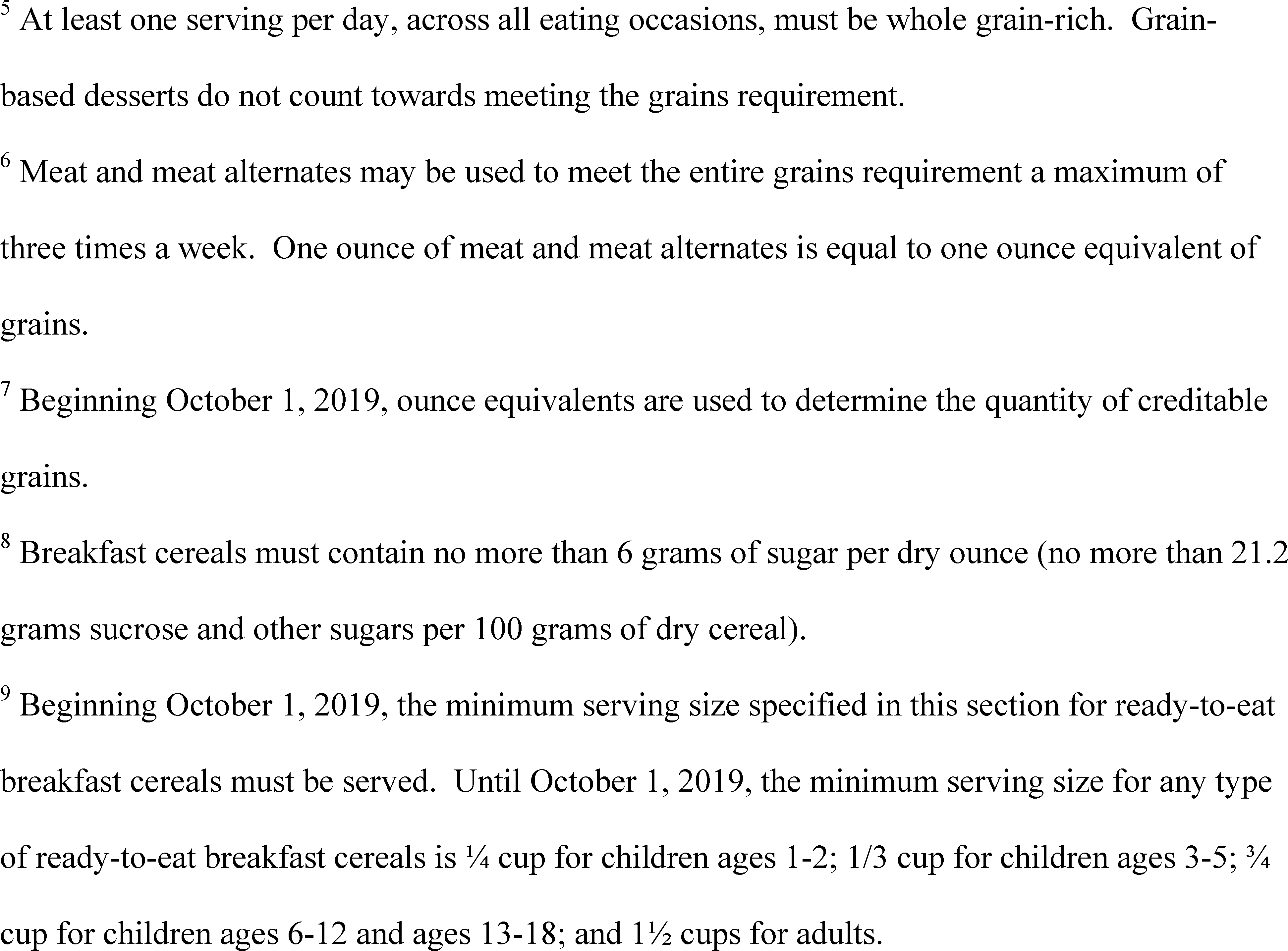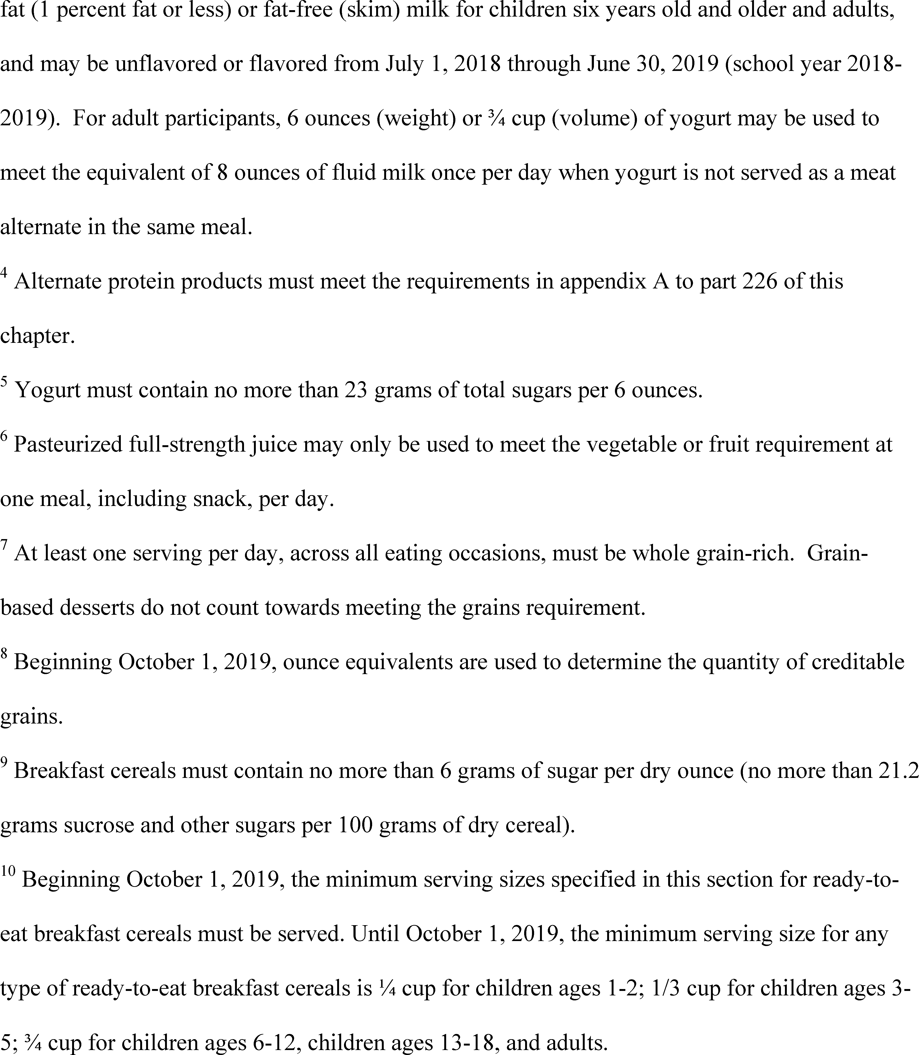 ) for each day less than 5. The servings for biscuits, rolls, muffins, and other grain/bread varieties are specified in FNS guidance. All grains offered must meet the whole grain-rich criteria specified in FNS guidance. Exemptions are allowed at the discretion of the State agency from July 1, 2018 through June 30, 2019 (school year 2018–2019). If allowed by the State agency, a school food authority may submit an exemption request for one or more products. The exemption requests must demonstrate hardship in meeting the requirement, address the criteria established in FNS guidance, and be submitted through the process established by the State agency. School food authorities that are granted an exemption from the current whole grain-rich requirement, at a minimum, must offer half of the weekly grains as whole grain-rich.