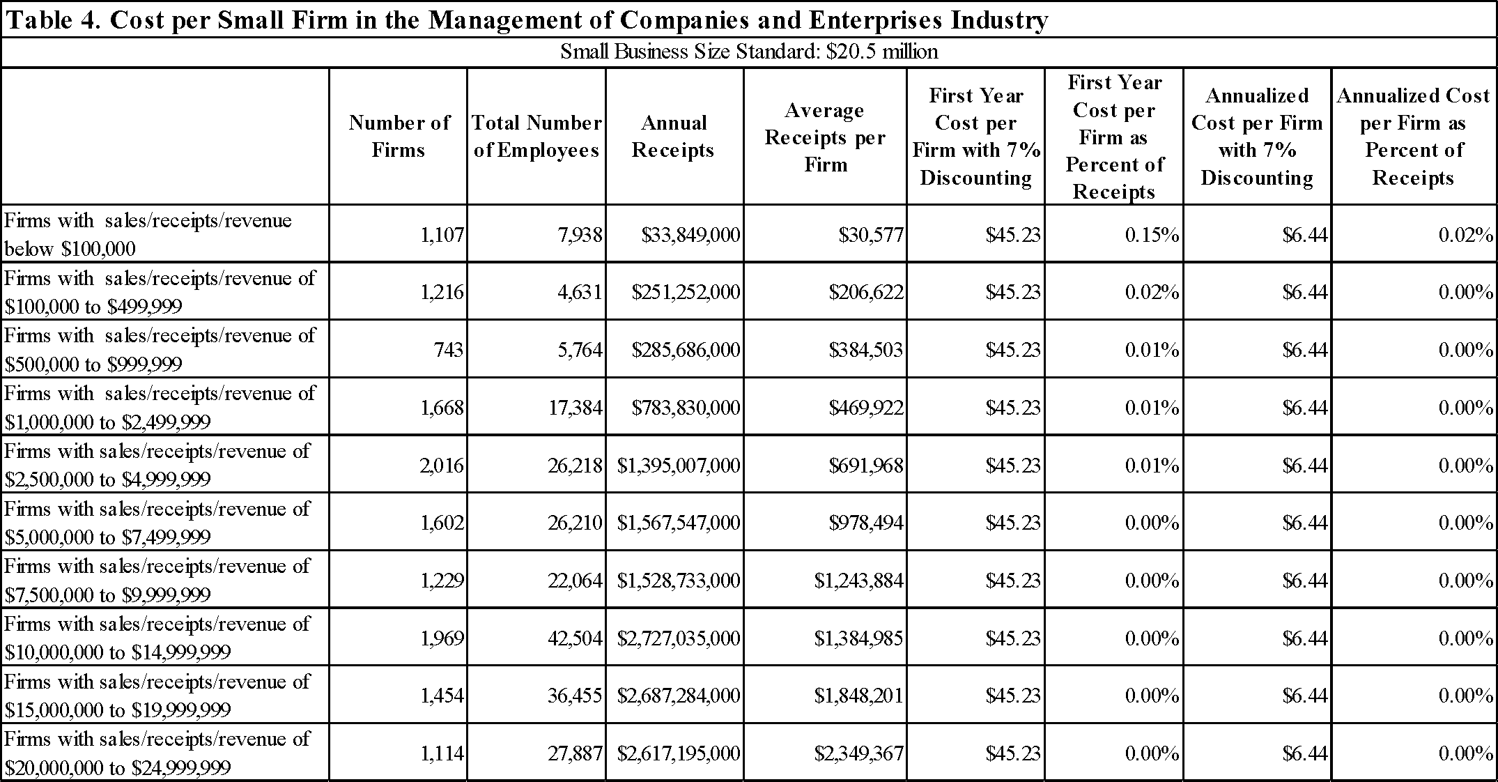 The Department used the following steps to estimate the cost of the proposed rule per small contractor firm as measured by a percentage of total annual receipts. First, the Department used Census SUSB data that disaggregates industry information by firm size in order to perform a robust analysis of the impact on small contractor firms. The Department applied the SBA small-business size standards to the SUSB data to determine the number of small firms in the affected industries. Then the Department used receipts data from the SUSB to calculate the cost per firm as a percentage of total receipts by dividing the estimated first year cost and the annualized cost per firm discounted at a 7 percent rate by the average annual receipts per firm. The methodology and results of two industries (construction and management of companies and enterprises) are presented in Tables 3 and 4.