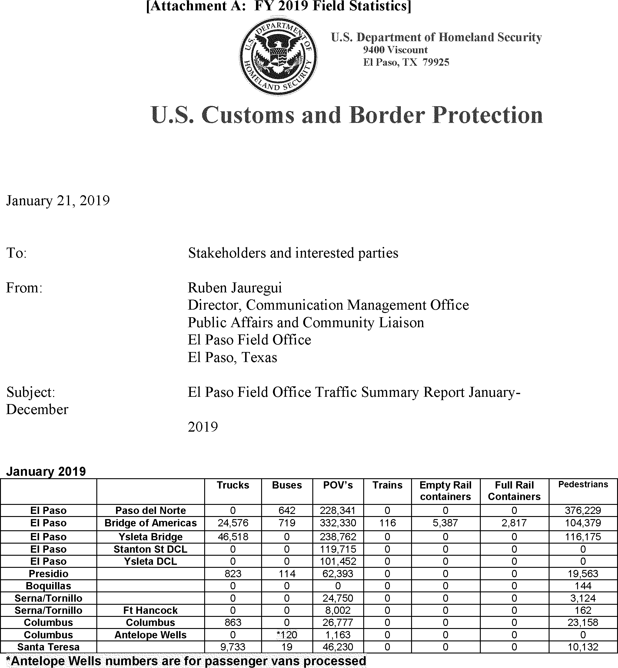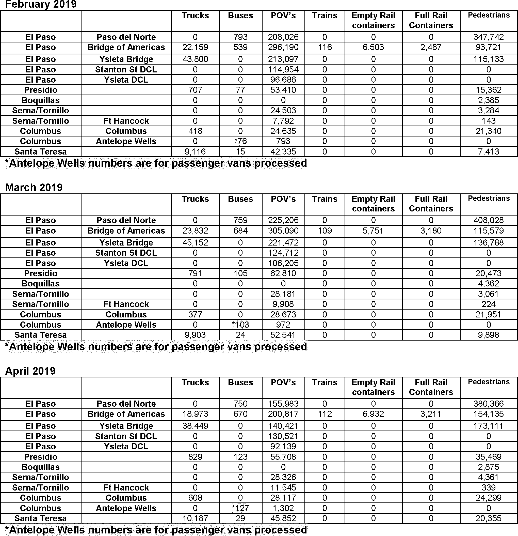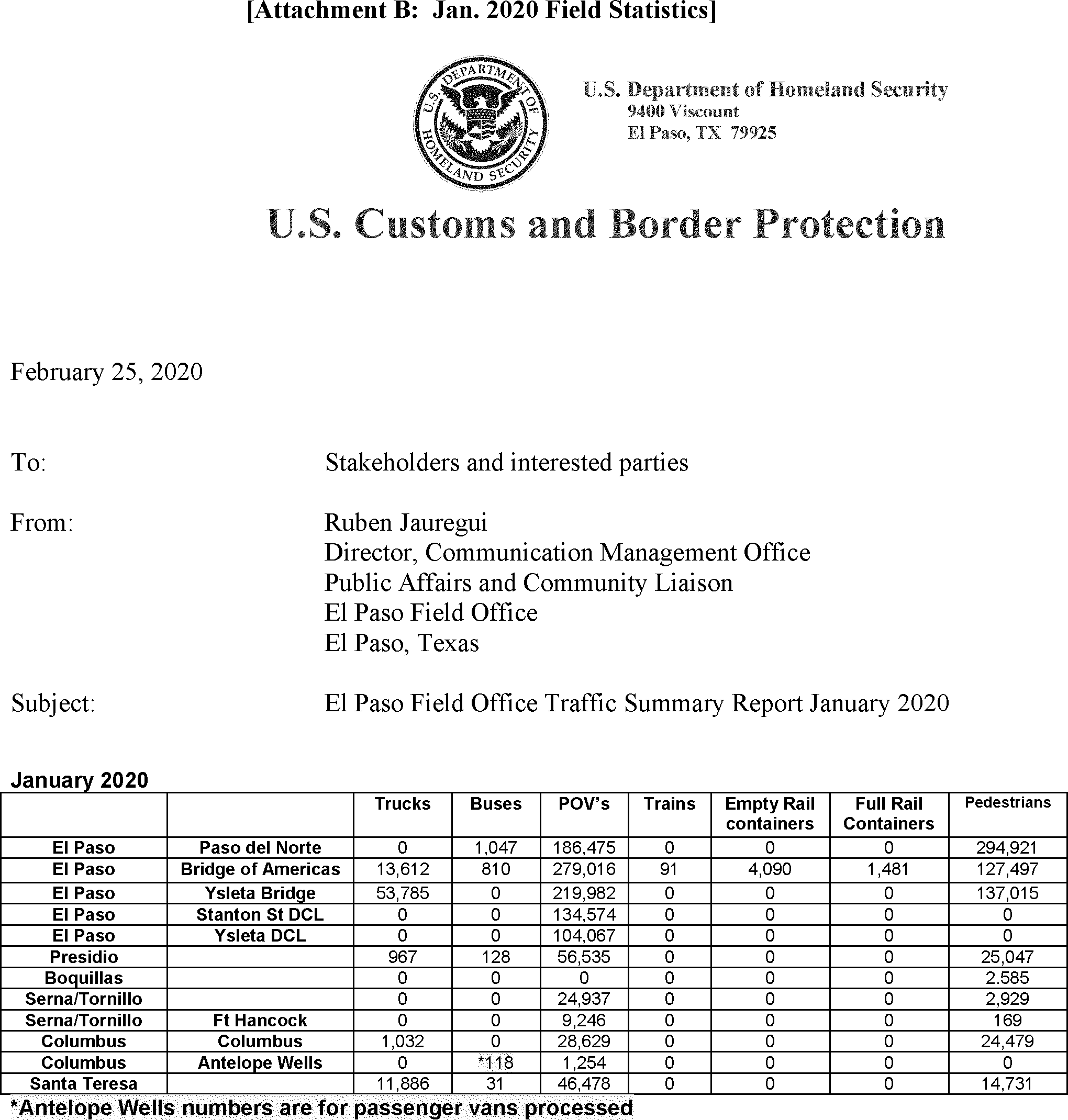 The El Paso PDN is one of the country's busiest border crossings, and sees approximately 10 million people entering the United States from Mexico annually. The El Paso PDN processes a flow of approximately 12,000 pedestrians and approximately 6-8,000 vehicles per day. Field statistics for FY19 and Jan. 2020 were supplied by the Public Affairs and Community Liaison Director, El Paso Field Office and are attached to this report, as Attachments A and B, respectively. The location is staffed by CBP officers 24/7 working 8 hour shifts. In addition, the facility has 24/7 coverage by a third party contracted Medical Team comprised of 3-4 members, led by a nurse practitioner or physician assistant, with the rest of the team comprised of emergency medical technicians or Registered Nurses.