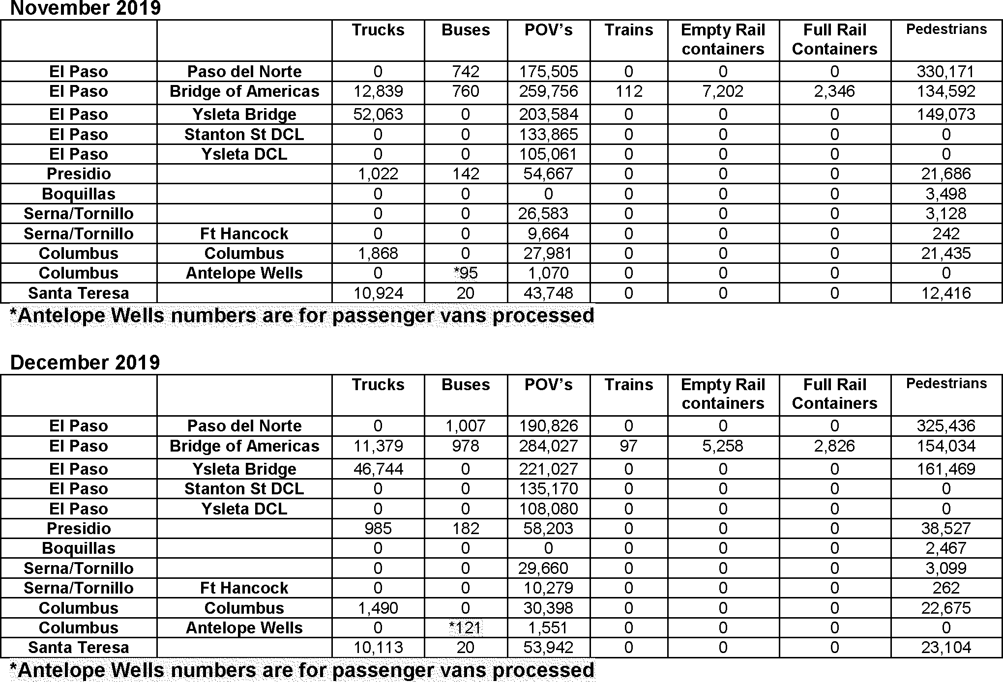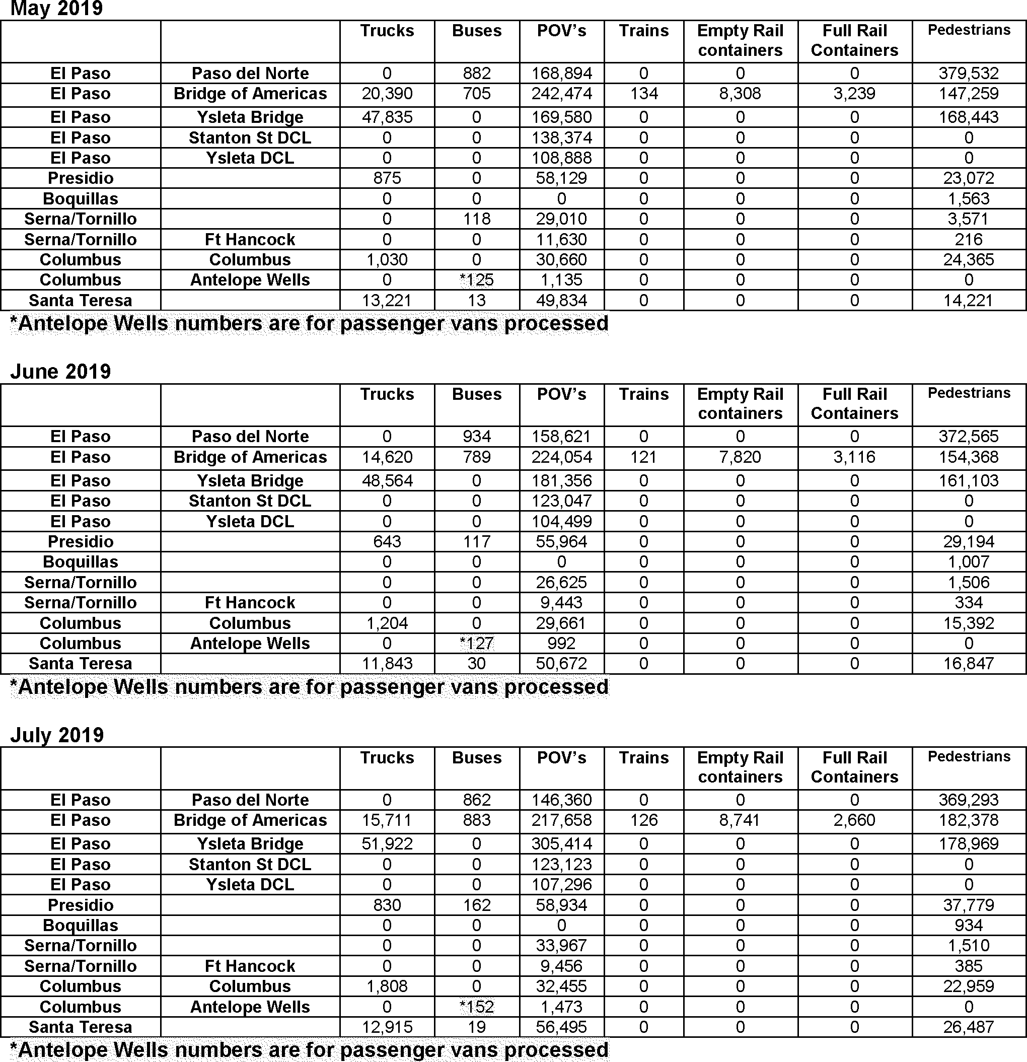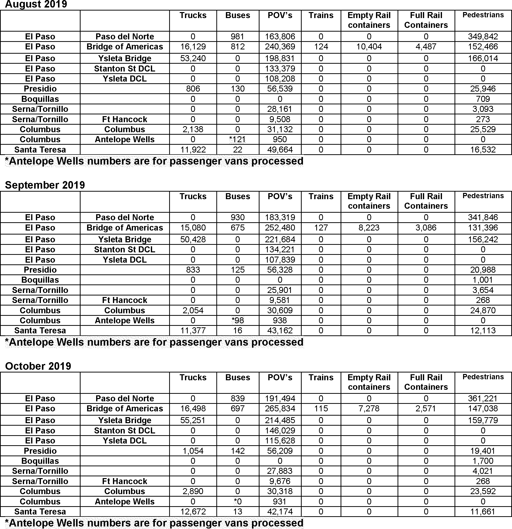 The El Paso PDN is one of the country's busiest border crossings, and sees approximately 10 million people entering the United States from Mexico annually. The El Paso PDN processes a flow of approximately 12,000 pedestrians and approximately 6-8,000 vehicles per day. Field statistics for FY19 and Jan. 2020 were supplied by the Public Affairs and Community Liaison Director, El Paso Field Office and are attached to this report, as Attachments A and B, respectively. The location is staffed by CBP officers 24/7 working 8 hour shifts. In addition, the facility has 24/7 coverage by a third party contracted Medical Team comprised of 3-4 members, led by a nurse practitioner or physician assistant, with the rest of the team comprised of emergency medical technicians or Registered Nurses.
