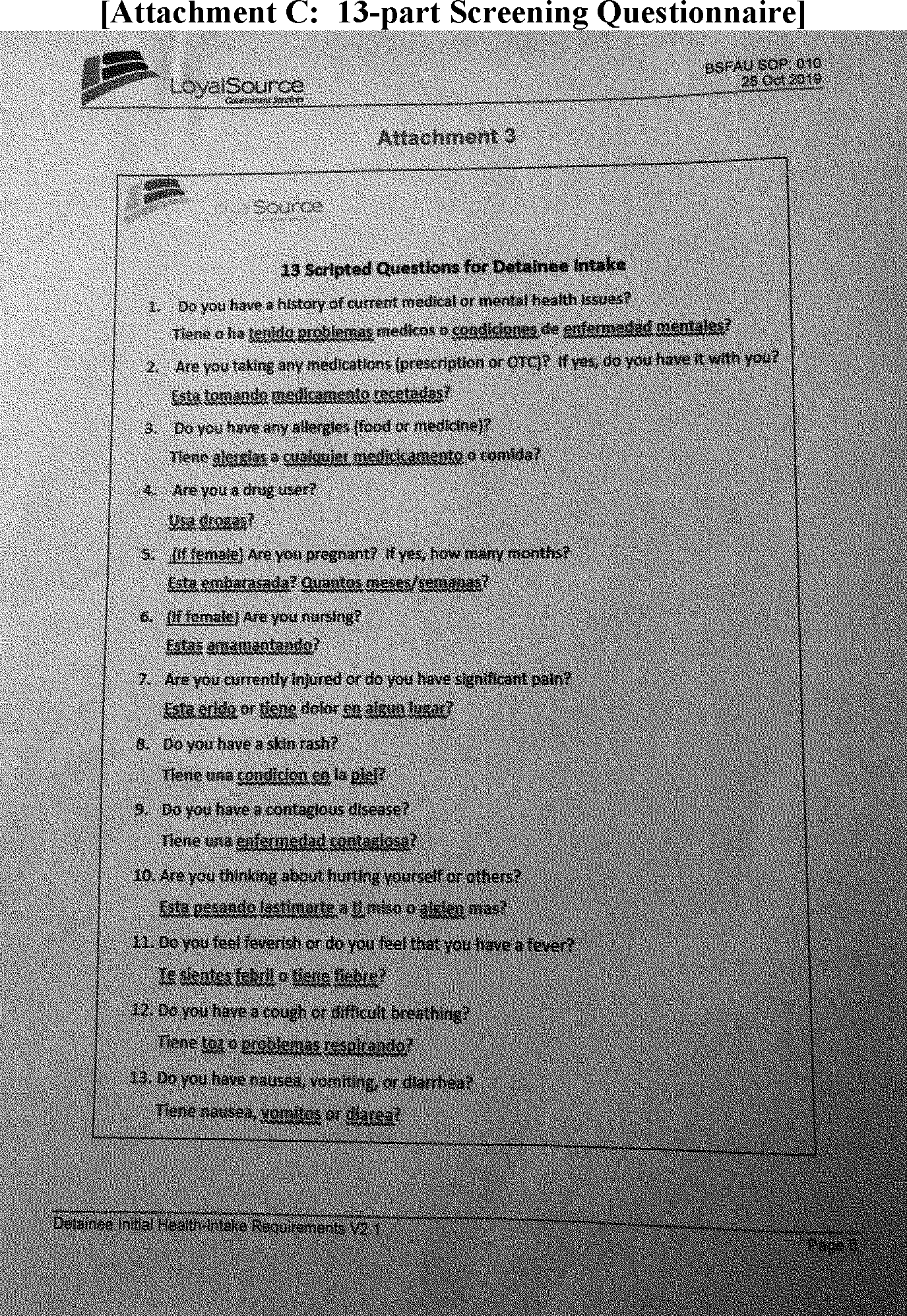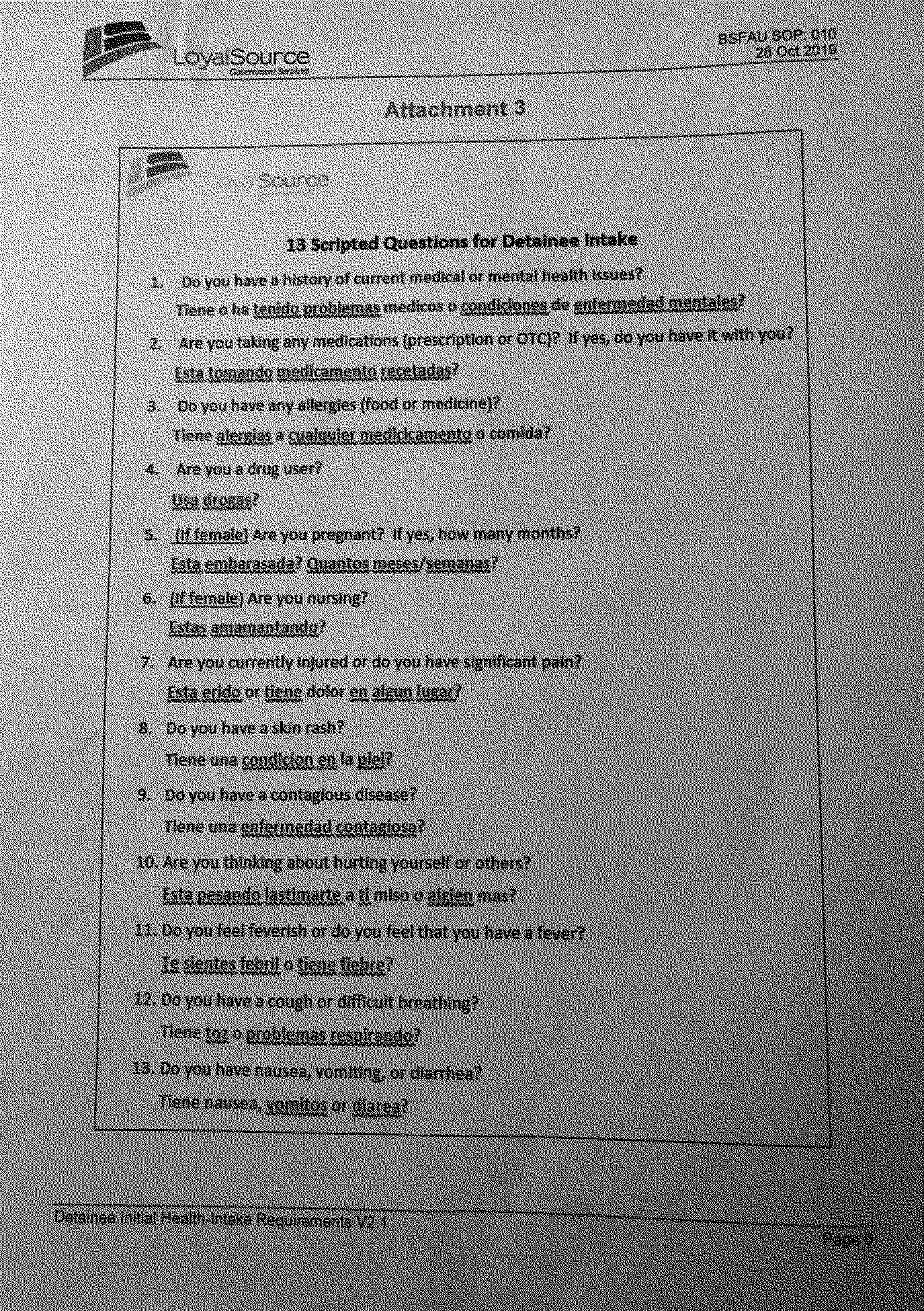 There are two points of entry into PDN: a pedestrian and vehicular mode. Both are staffed by the same CBP officers from El Paso. Each person seeking entry to the United States at PDN is asked a series of questions upon encountering the CBP officer, including the travel-related COVID-19 screening questions. Officers use visual cues as well as responses to the screening questions to determine the level of risk of COVID-19 infection. If CBP officers suspect any level of risk or signs/symptoms of illness, they put on a surgical mask (CBP officers wear gloves as a normal practice) and give a surgical mask to the individual as well. The officer would then escort the individual to an area where the officer would first inspect the individual for anything that could be used as a weapon, and then fingerprint the individual (if applicable). The individual would then be triaged to an area where they would be administered a 13-part questionnaire, with a series of questions added about COVID-19 by the third party contract Medical Team. The questionnaire is attached as Attachment C.