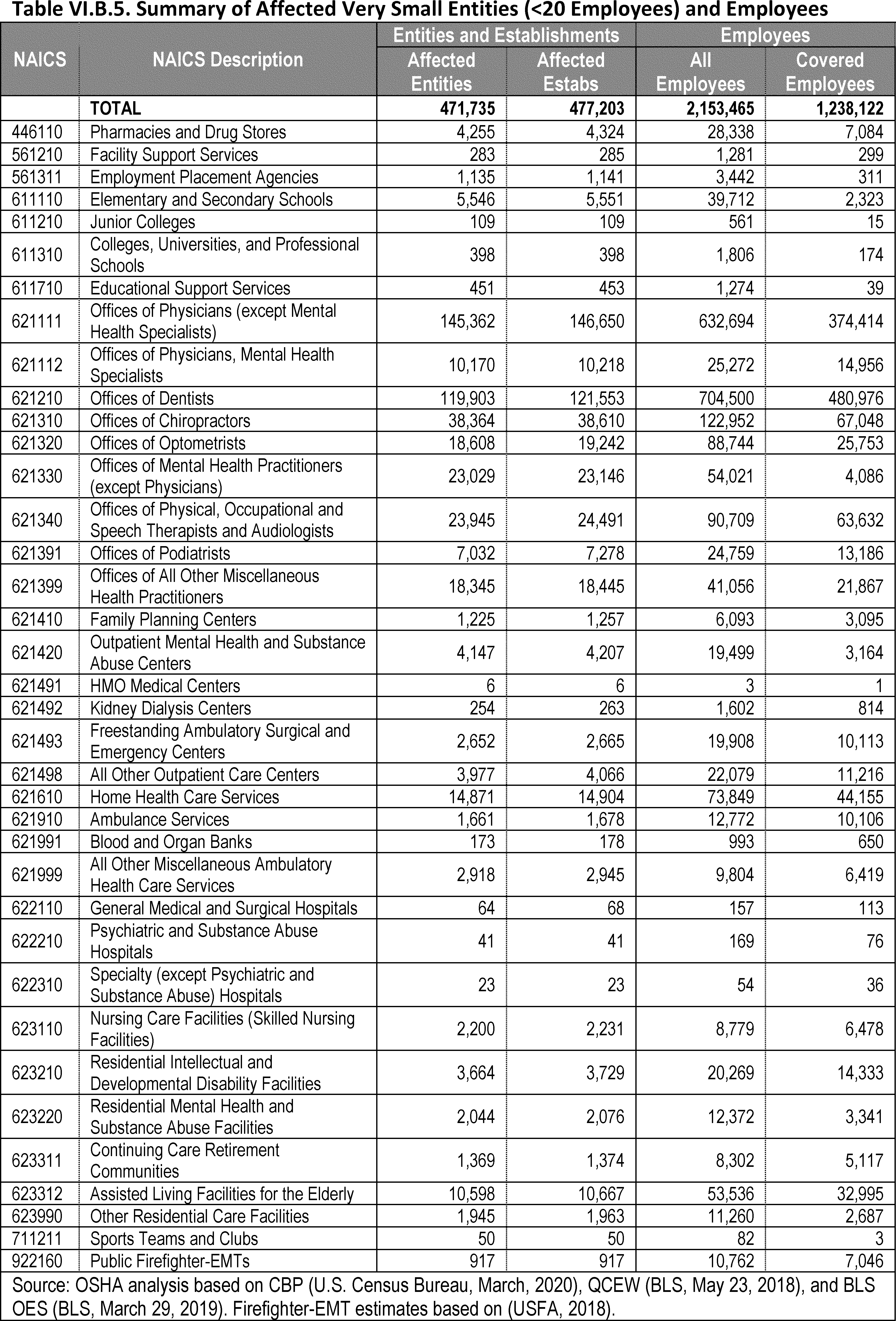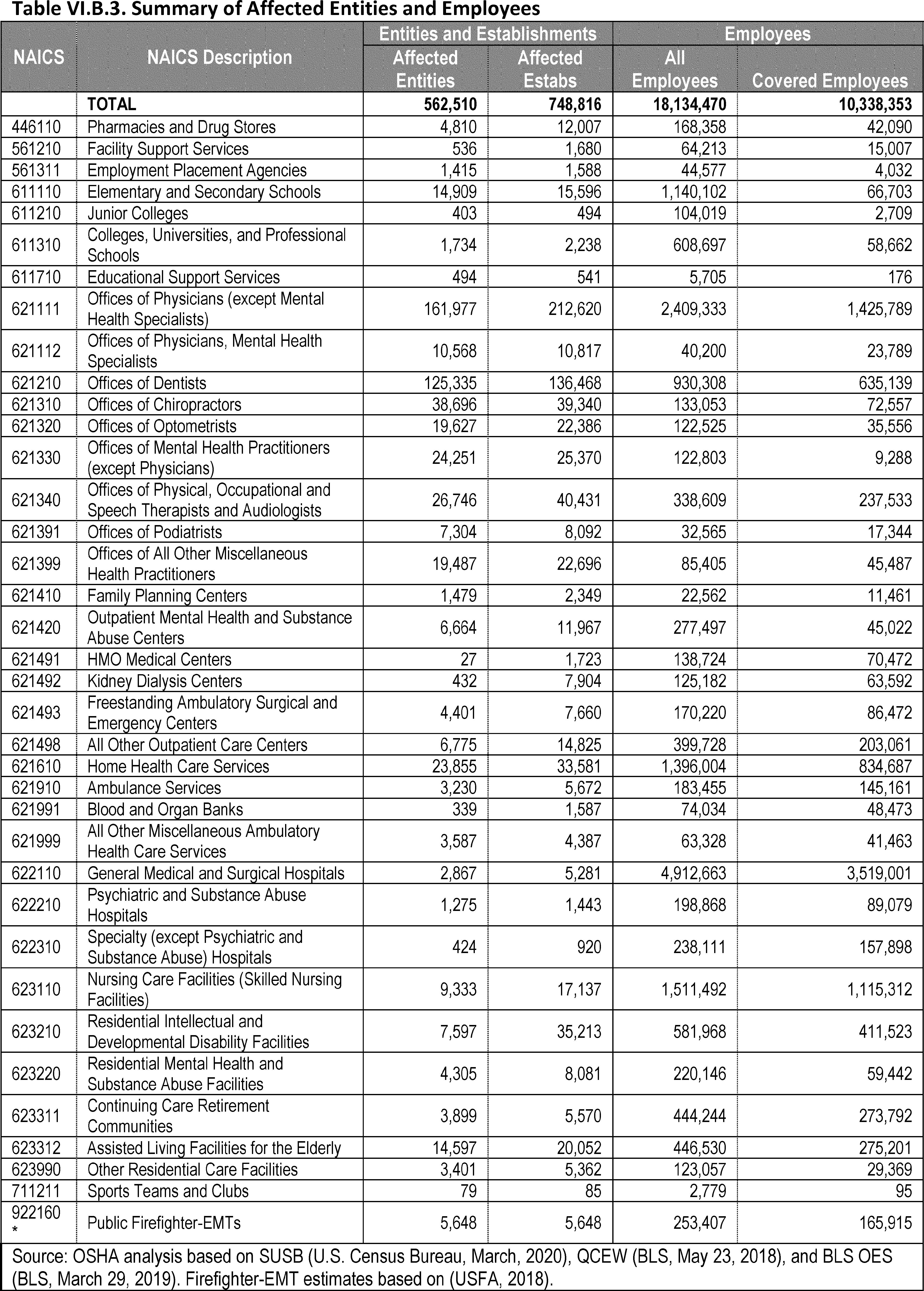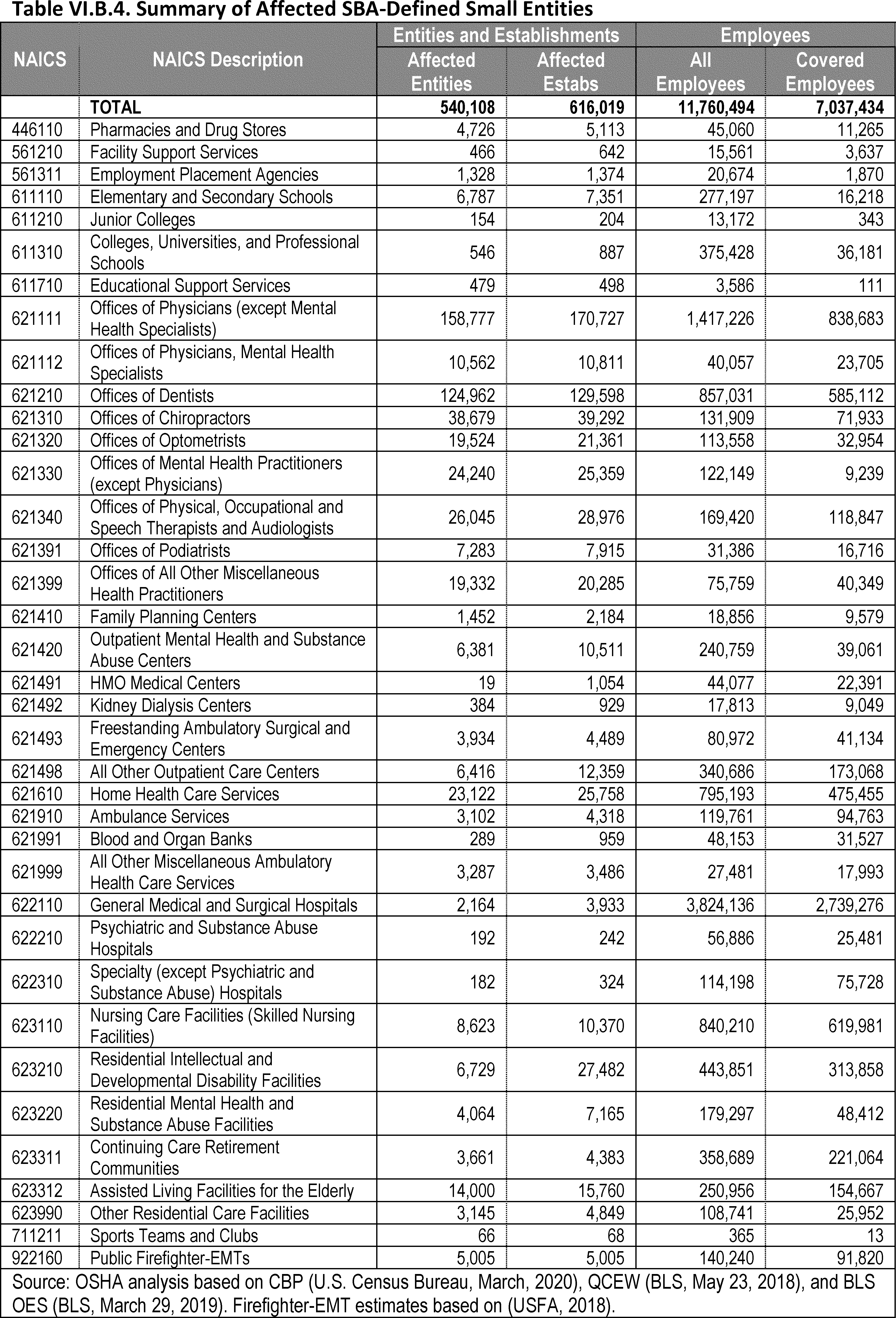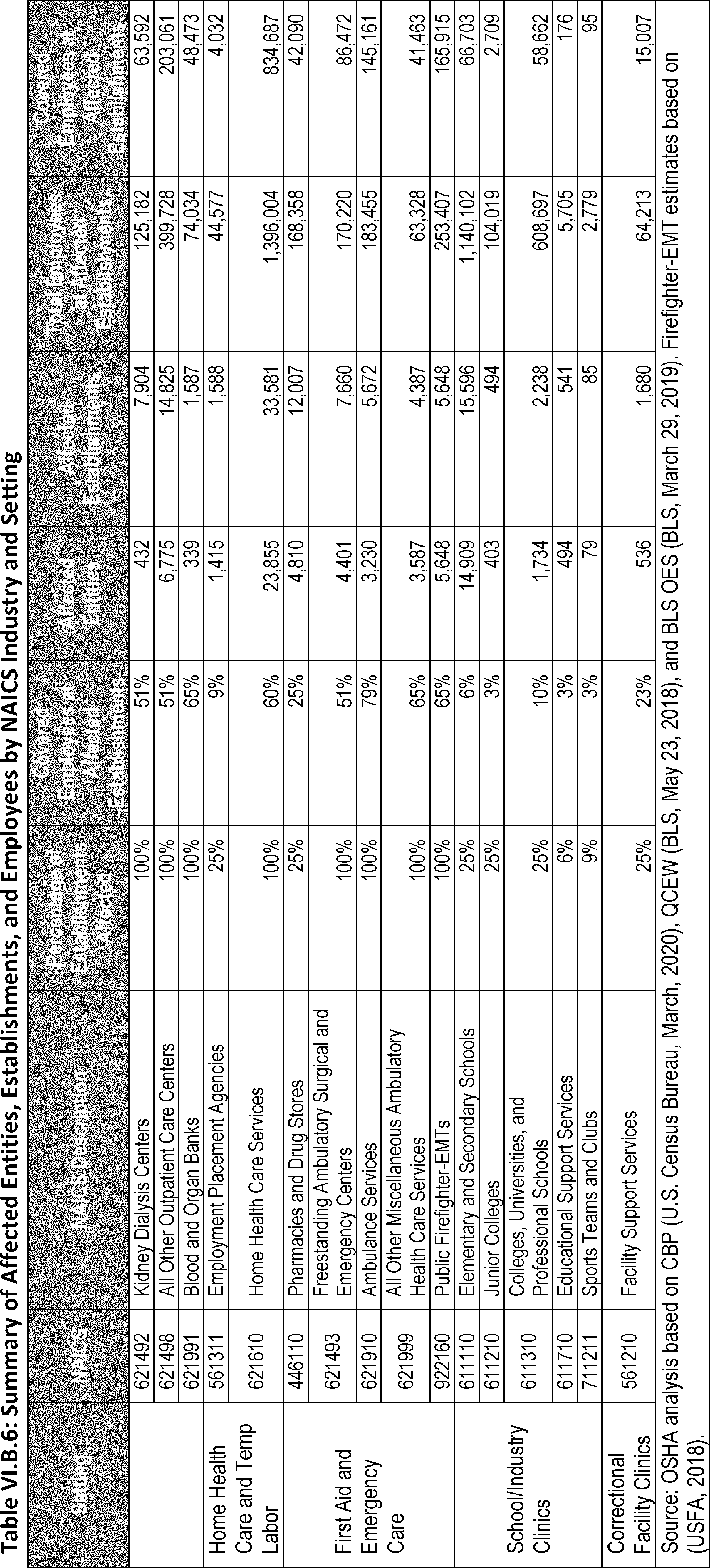 The Occupational Safety and Health Administration (OSHA) is issuing an emergency temporary standard (ETS) to protect healthcare and healthcare support service workers from occupational exposure to COVID-19 in settings where people with COVID-19 are reasonably expected to be present. During the period of the emergency standard, covered healthcare employers must develop and implement a COVID-19 plan to identify and control COVID-19 hazards in the workplace. Covered employers must also implement other requirements to reduce transmission of COVID-19 in their workplaces, related to the following: Patient screening and management; Standard and Transmission-Based Precautions; personal protective equipment (PPE), including facemasks or respirators; controls for aerosol-generating procedures; physical distancing of at least six feet, when feasible; physical barriers; cleaning and disinfection; ventilation; health screening and medical management; training; anti-retaliation; recordkeeping; and reporting. The standard encourages vaccination by requiring employers to provide reasonable time and paid leave for employee vaccinations and any side effects. It also encourages use of respirators, where respirators are used in lieu of required facemasks, by including a mini respiratory protection program that applies to such use. Finally, the standard exempts from coverage certain workplaces where all employees are fully vaccinated and individuals with possible COVID-19 are prohibited from entry; and it exempts from some of the requirements of the standard fully vaccinated employees in well-defined areas where there is no reasonable expectation that individuals with COVID-19 will be present.