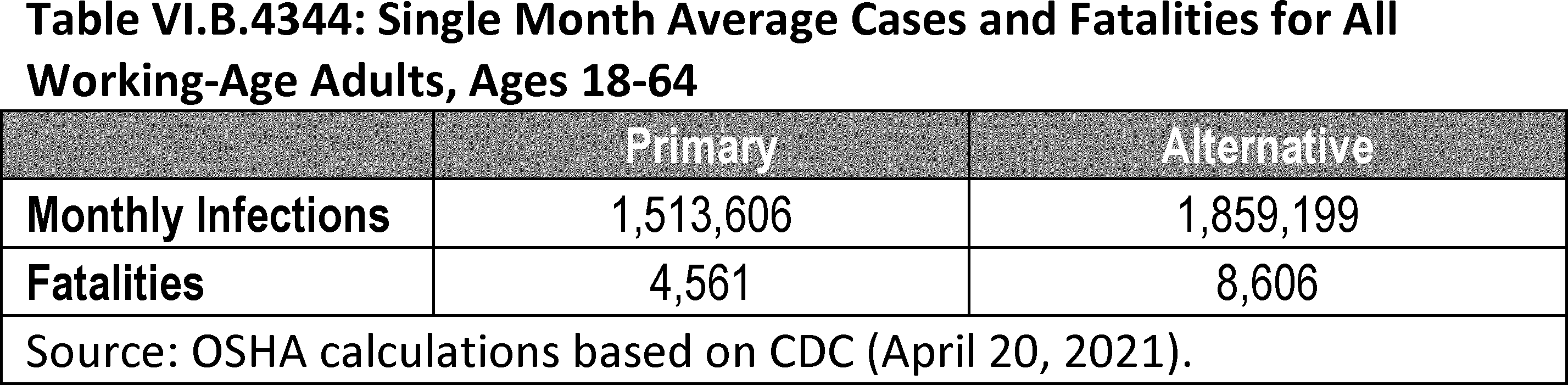 of COVID-19 have occurred in a wide variety of occupations in healthcare settings. The scientific Start Printed Page 32383evidence of SARS-CoV-2 transmission, presented below, makes clear that the virus can be spread wherever an infectious person is present and shares space with other people, and OSHA therefore expects transmission across healthcare workplaces where known or suspected COVID-19 patients are treated (see Dry Color Mfrs. Ass'n, Inc. v. Dep't of Labor, 486 F.2d 98, 102 n.3 (3d Cir. 1973) (holding that when OSHA determines a substance poses a grave danger to workers, OSHA can assume an exposure to a grave danger wherever that substance is present in a workplace)). OSHA's conclusion that there is a grave danger to which employees are specifically exposed is further supported by evidence demonstrating the widespread prevalence of the disease across the country generally. As of May 2021, over 32 million cases of COVID-19 have been reported in the United States (CDC, May 24, 2021e). Over 1 in 11 people of working age have been reported infected (cases for individuals age 18-64, CDC, May 24, 2021d; estimated number of people ages 15-64, Census Bureau, June 25, 2020). And data shows that employees across a myriad of workplace settings have suffered death and serious illness from COVID-19 through the duration of the pandemic (WSDH and WLNI, December 17, 2020; Allan-Blitz et al., December 11, 2020; Marshall et al., June 30, 2020).[]