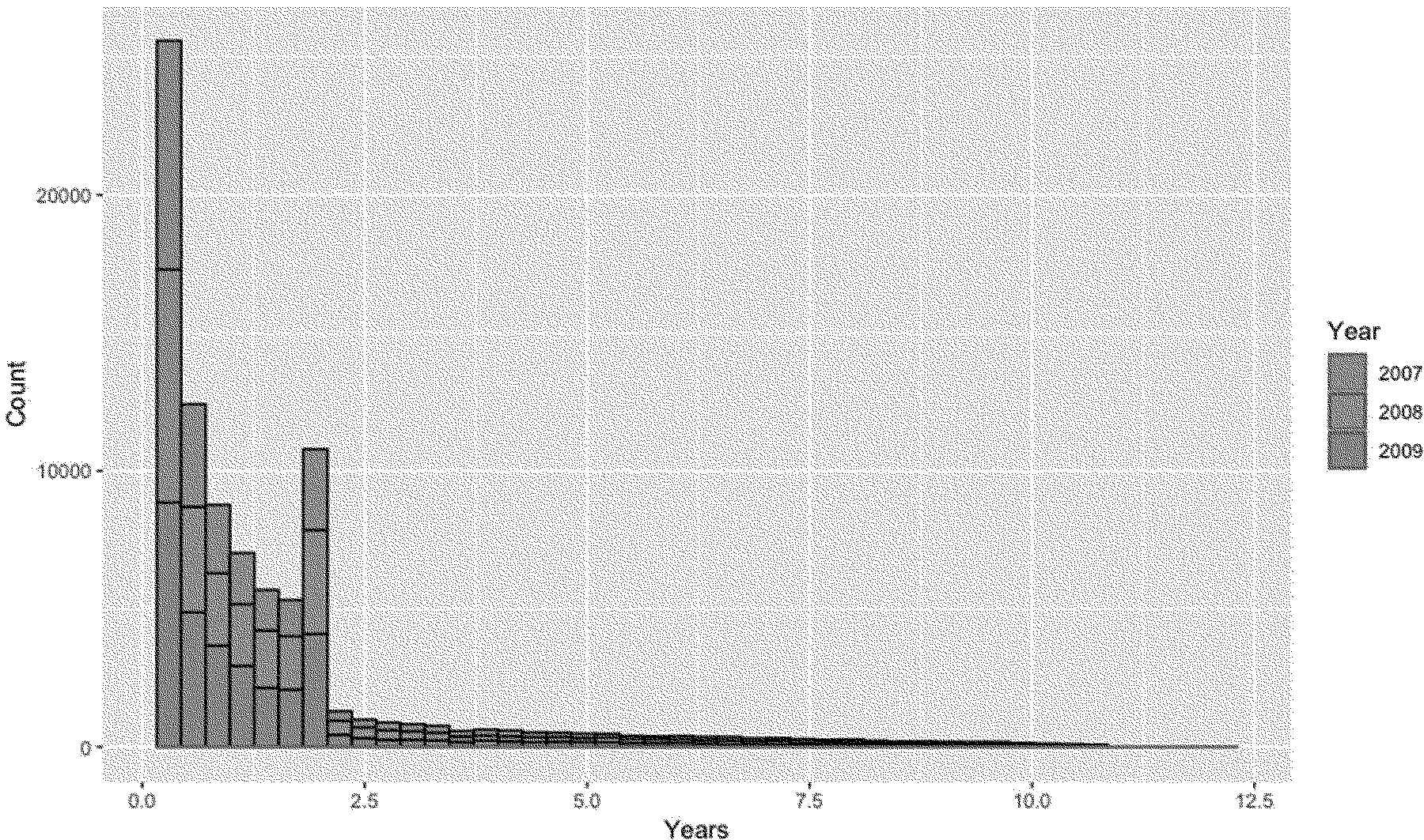 Figure 1: Plot of the number of previously registered persons that reregister within a given number of years after having terminated their registrations for at least 60 days in either 2007, 2008 or 2009. Each bar represents 100 days, and every year is accordingly represented by approximately three-and-a-half bars.Start Printed Page 33434