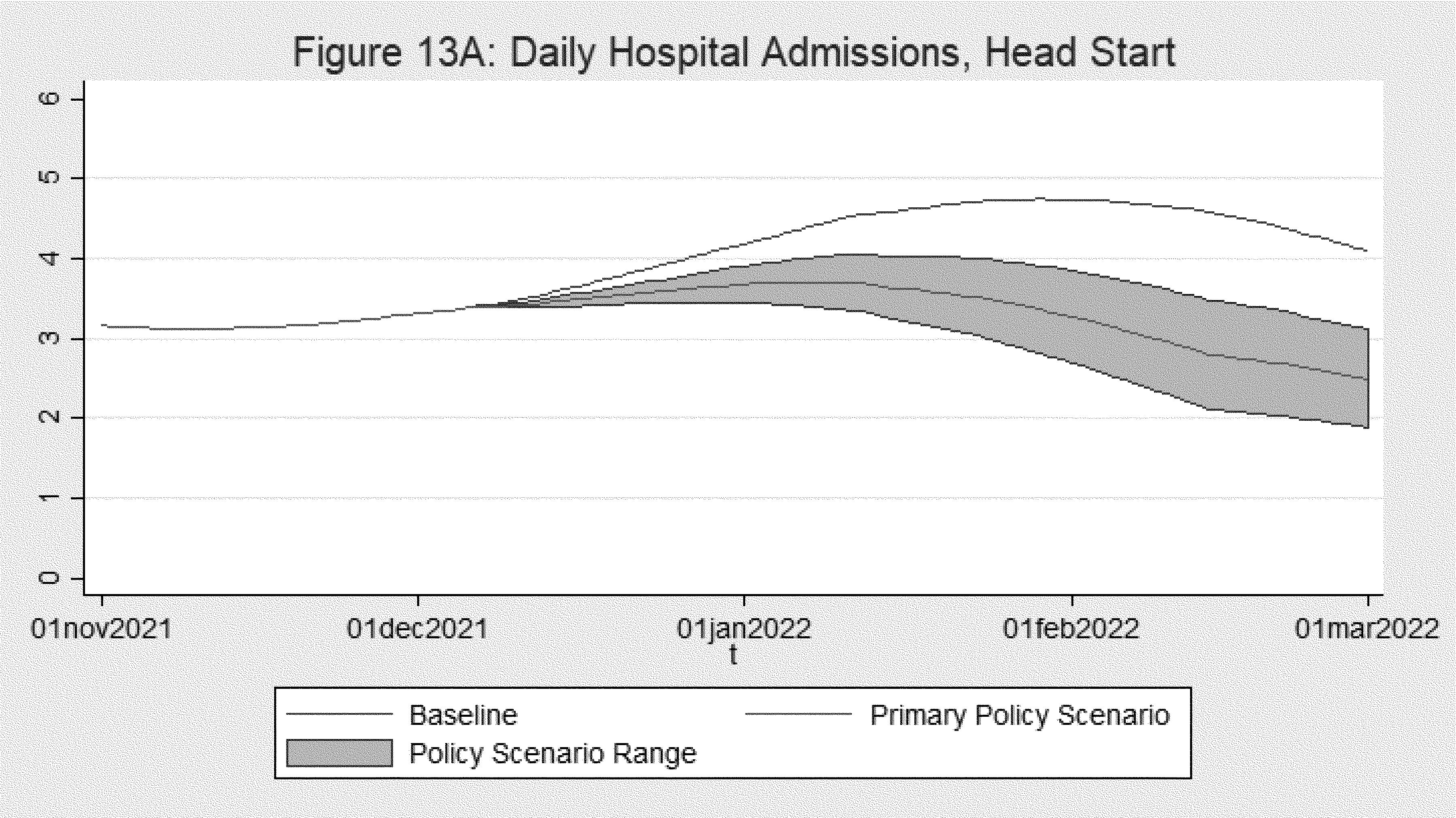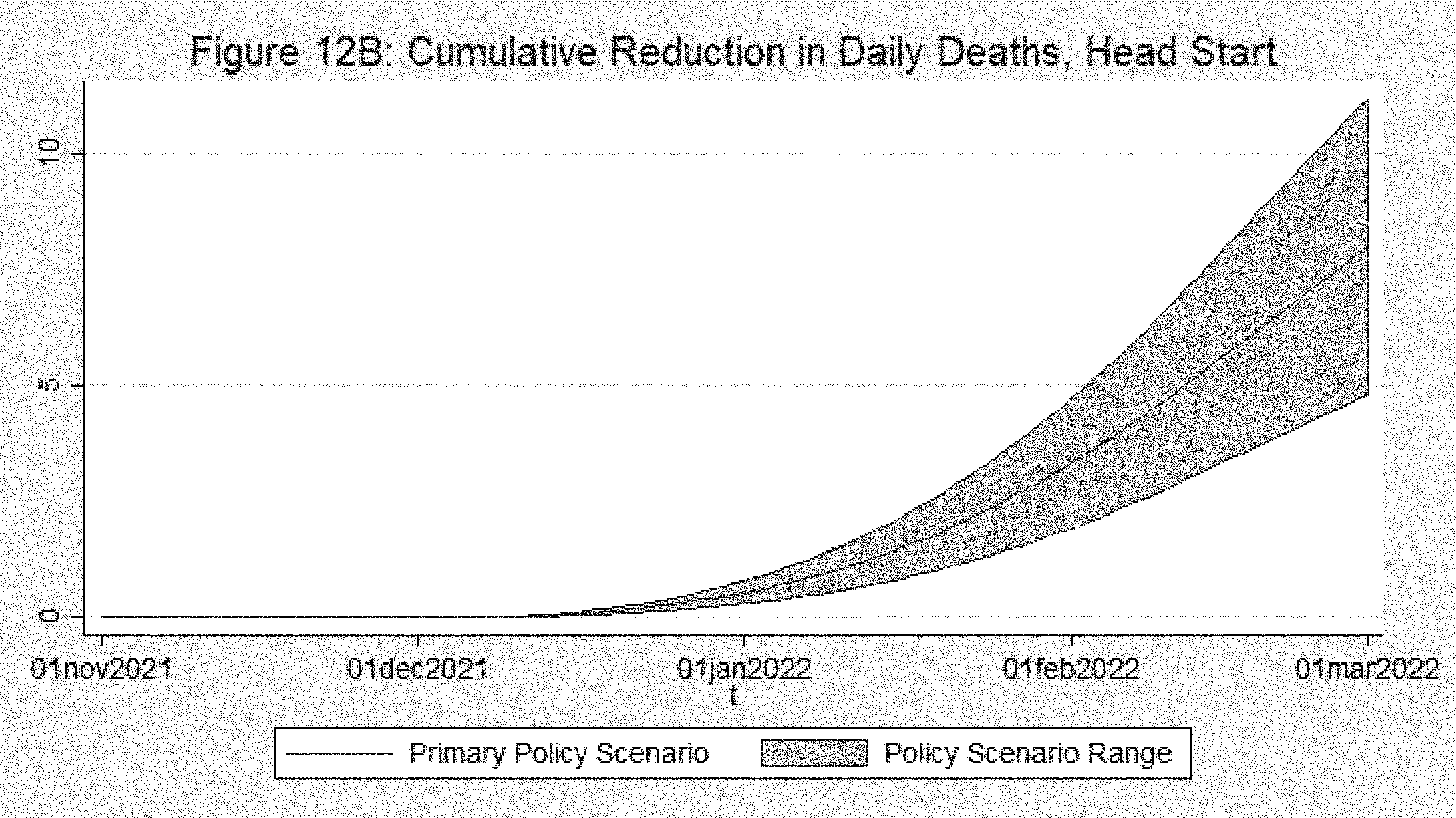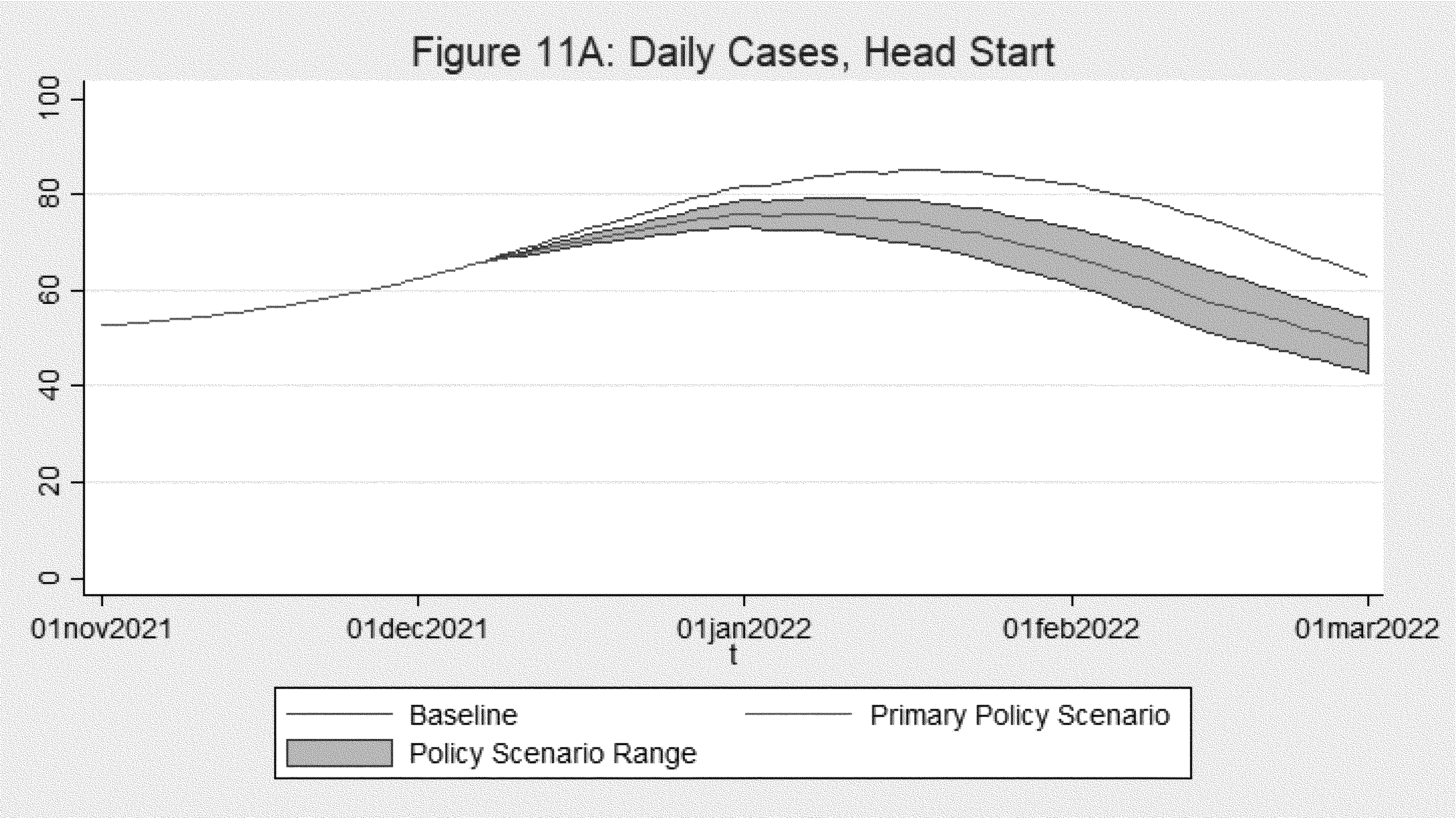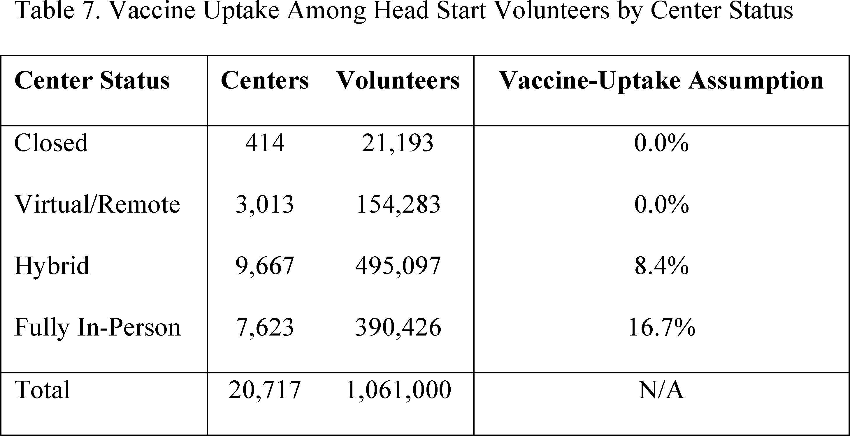 0.73/0.65 ≉ 1.12. We perform calculations in the model based on the share of individuals who are unvaccinated. The comparable calculation is 1−[(1−0.73)/(1−0.65)] ≉ 0.23, which indicates that Head Start staff are about 23% less likely to be unvaccinated than the general adult population.