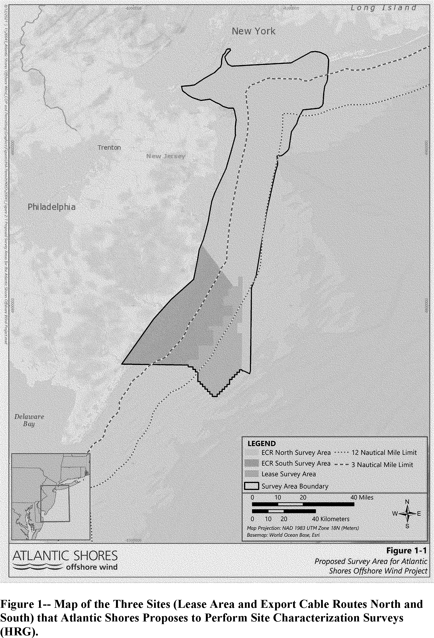 Atlantic Shores' proposed marine site characterization surveys include HRG and geotechnical survey activities. These survey activities would occur within the both the Lease Area and within ECRs between the Lease Area and the coasts of New York and New Jersey. The Lease Area is approximately 5,867.97 km2