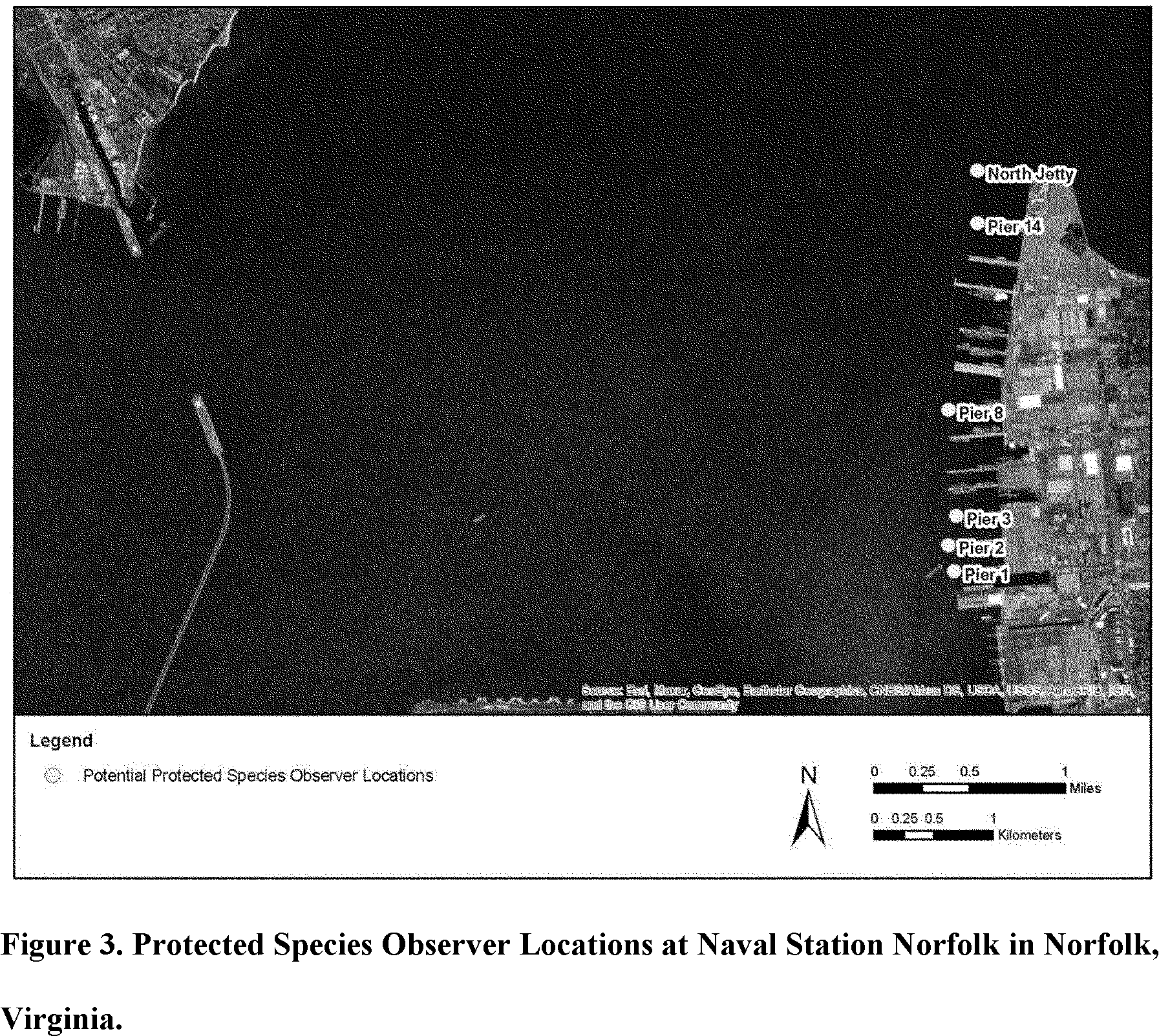 The purpose of this project is to replace Pier 3 at Naval Station (NAVSTA) Norfolk in Norfolk, VA. The existing Pier 3 will be completely demolished and a new Pier 3 will be constructed immediately north of the existing location (See Figure 1). Work at Pier 4, Pier 3T and the bulkheads associated with Pier 3 and 3T (CEP-175, CEP-176, and CEP-102) will also occur (See Figure 1). The project includes impact and vibratory pile driving and vibratory pile removal and drilling. Drilling is considered a continuous noise source, similar to vibratory pile driving. Sounds resulting from pile driving and removal may result in the incidental take of marine mammals by Level A and Level B harassment in the form of auditory injury or behavioral harassment. The in-water construction period for the action will occur over 12 months.