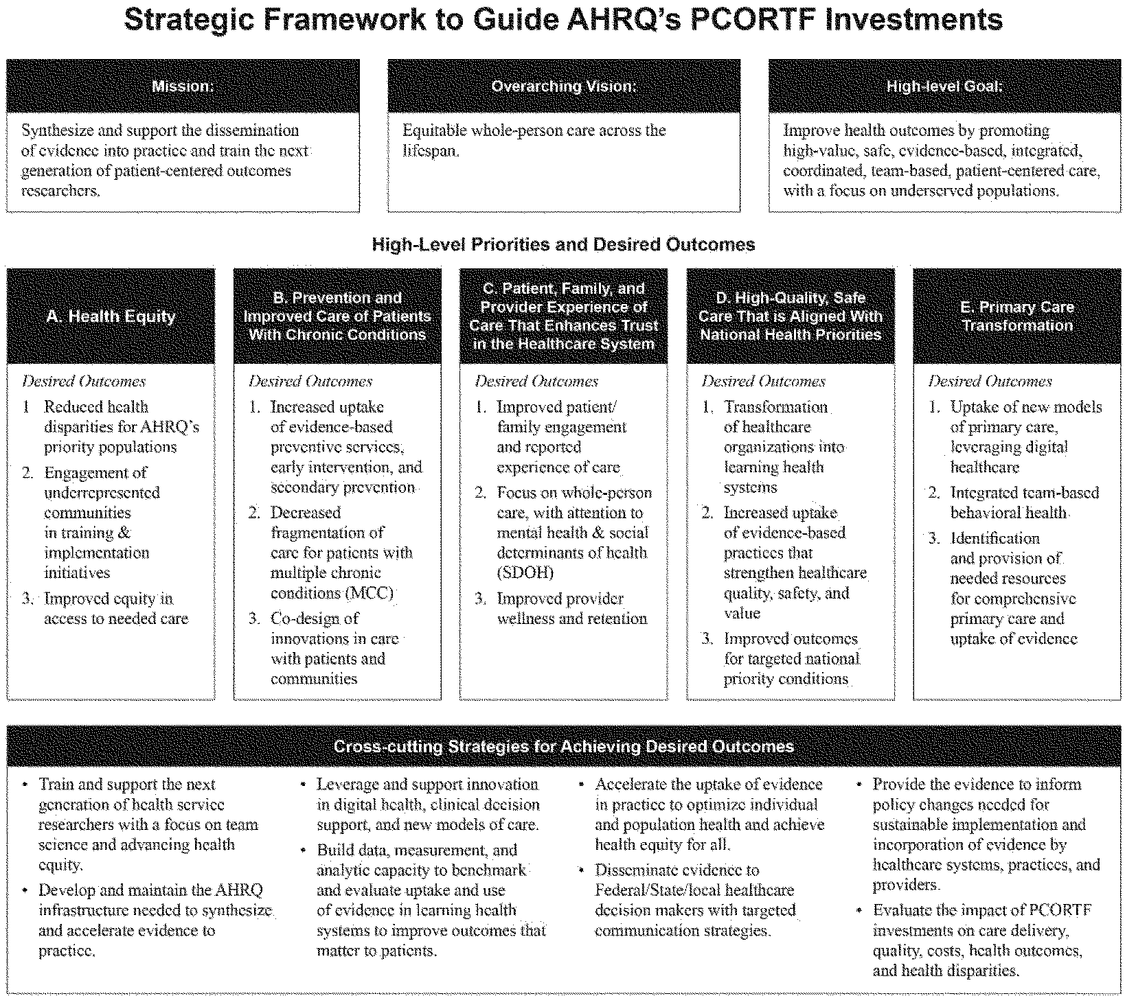 The AHRQ PCORTF strategic framework includes a mission, vision, high-level priorities, desired outcomes, and cross-cutting strategies for advancing the desired outcomes. This framework is expected to describe and inform the portfolio of AHRQ PCORTF investments. AHRQ will use this broad framework to guide long-range planning and to guide the development of projects and investments.
