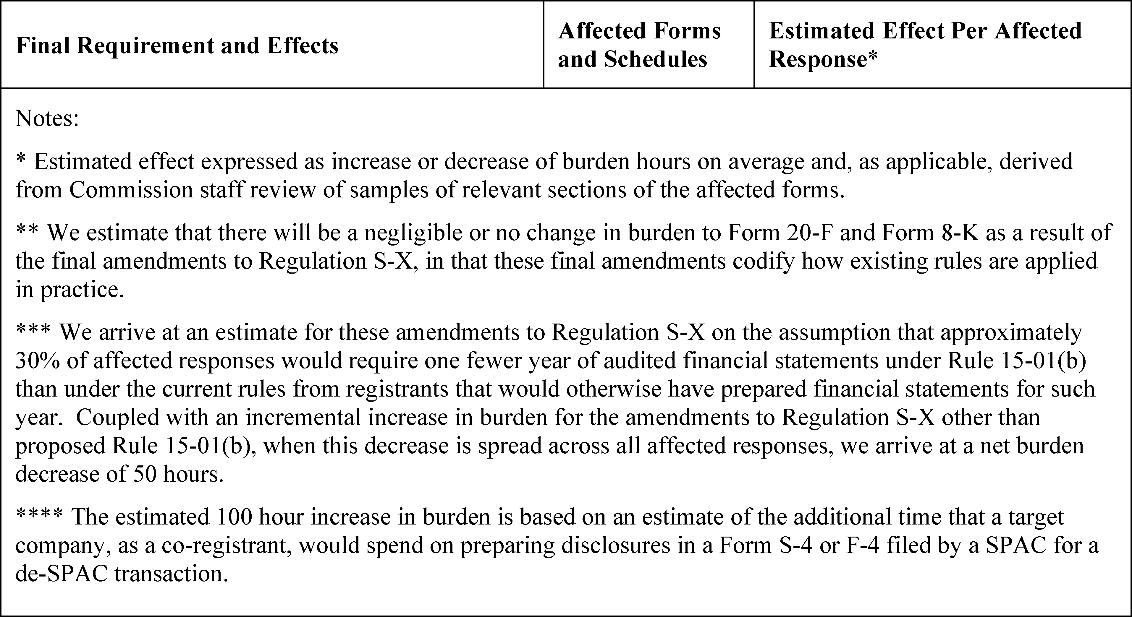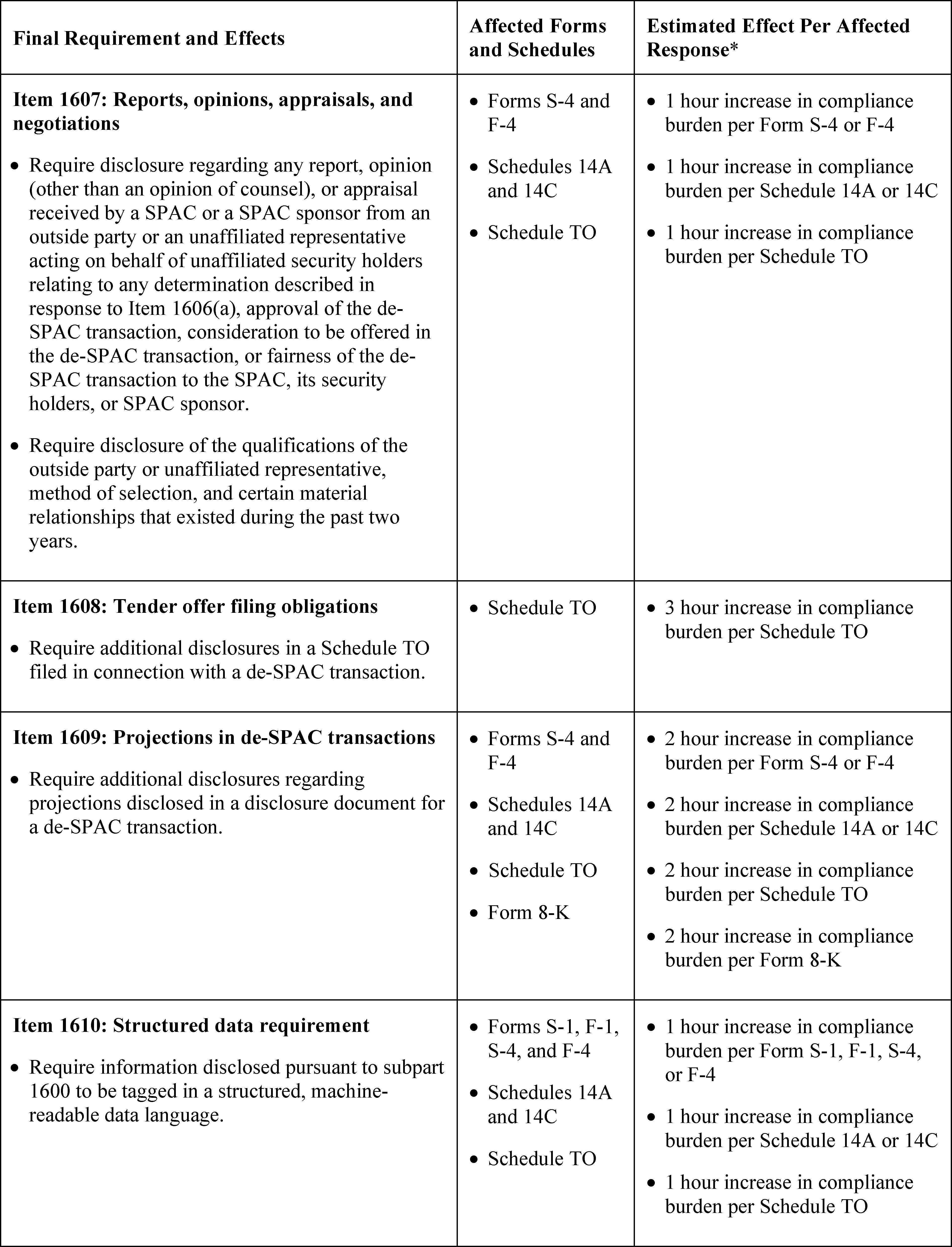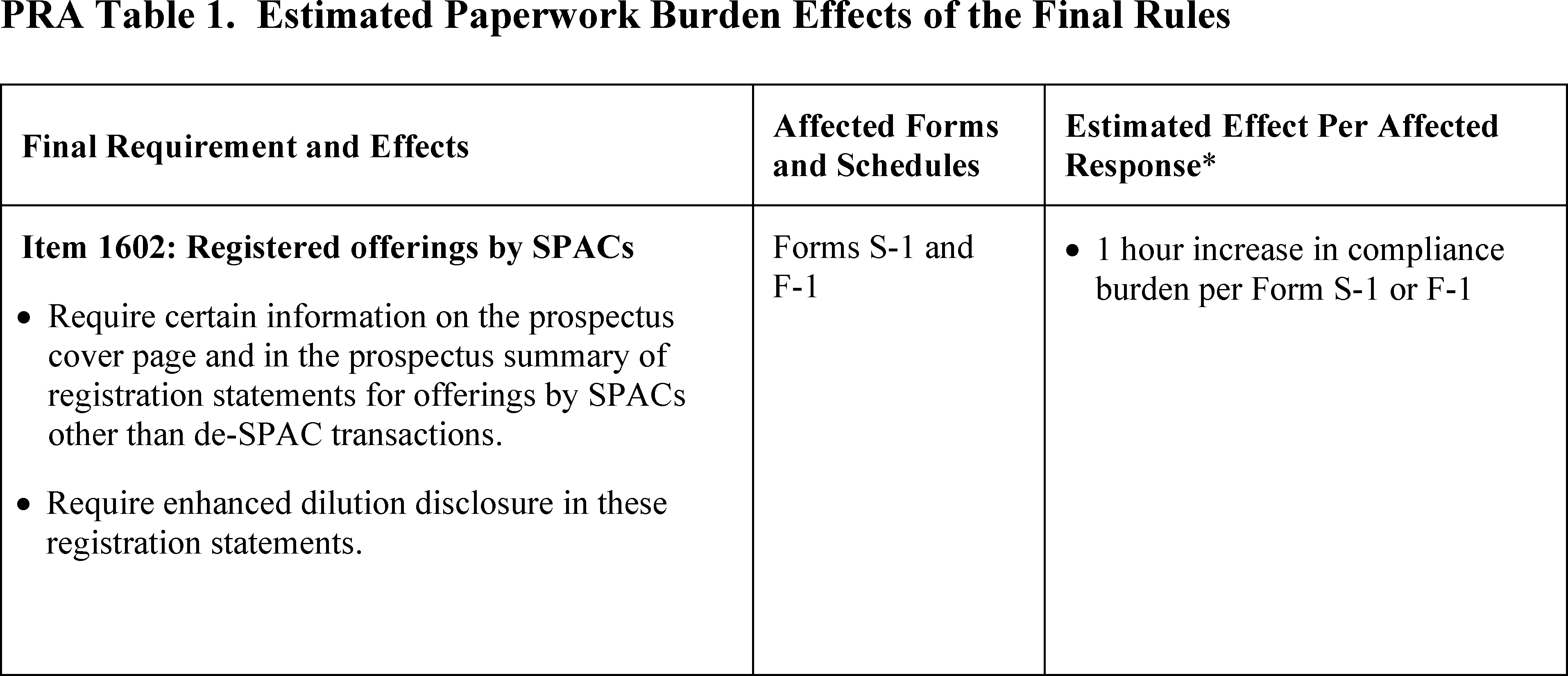 The Securities and Exchange Commission (“Commission”) is adopting rules intended to enhance investor protections in initial public offerings by special purpose acquisition companies (commonly known as SPACs) and in subsequent business combination transactions between SPACs and private operating companies (commonly known as de-SPAC transactions). Specifically, we are adopting disclosure requirements with respect to, among other things, compensation paid to sponsors, conflicts of interest, dilution, and the determination, if any, of the board of directors (or similar governing body) of a SPAC regarding whether a de-SPAC transaction is advisable and in the best interests of the SPAC and its security holders. We are adopting rules that require a minimum dissemination period for the distribution of security holder communication materials in connection with de-SPAC transactions. We are adopting rules that require the re-determination of smaller reporting company (“SRC”) status in connection with de-SPAC transactions. We are also adopting rules that address the scope of the safe harbor for forward-looking statements under the Private Securities Litigation Reform Act of 1995. Further, we are adopting a rule that would deem any business combination transaction involving a reporting shell company, including a SPAC, to be a sale of securities to the reporting shell company's shareholders and are adopting amendments to a number of financial statement requirements applicable to transactions involving shell companies. In addition, we are providing guidance on the status of potential underwriters in de-SPAC transactions and adopting updates to our guidance regarding the use of projections in Commission filings as well as requiring additional disclosure regarding projections when used in connection with business combination transactions involving SPACs. Finally, we are providing guidance for SPACs to consider when analyzing their status under the Investment Company Act of 1940.